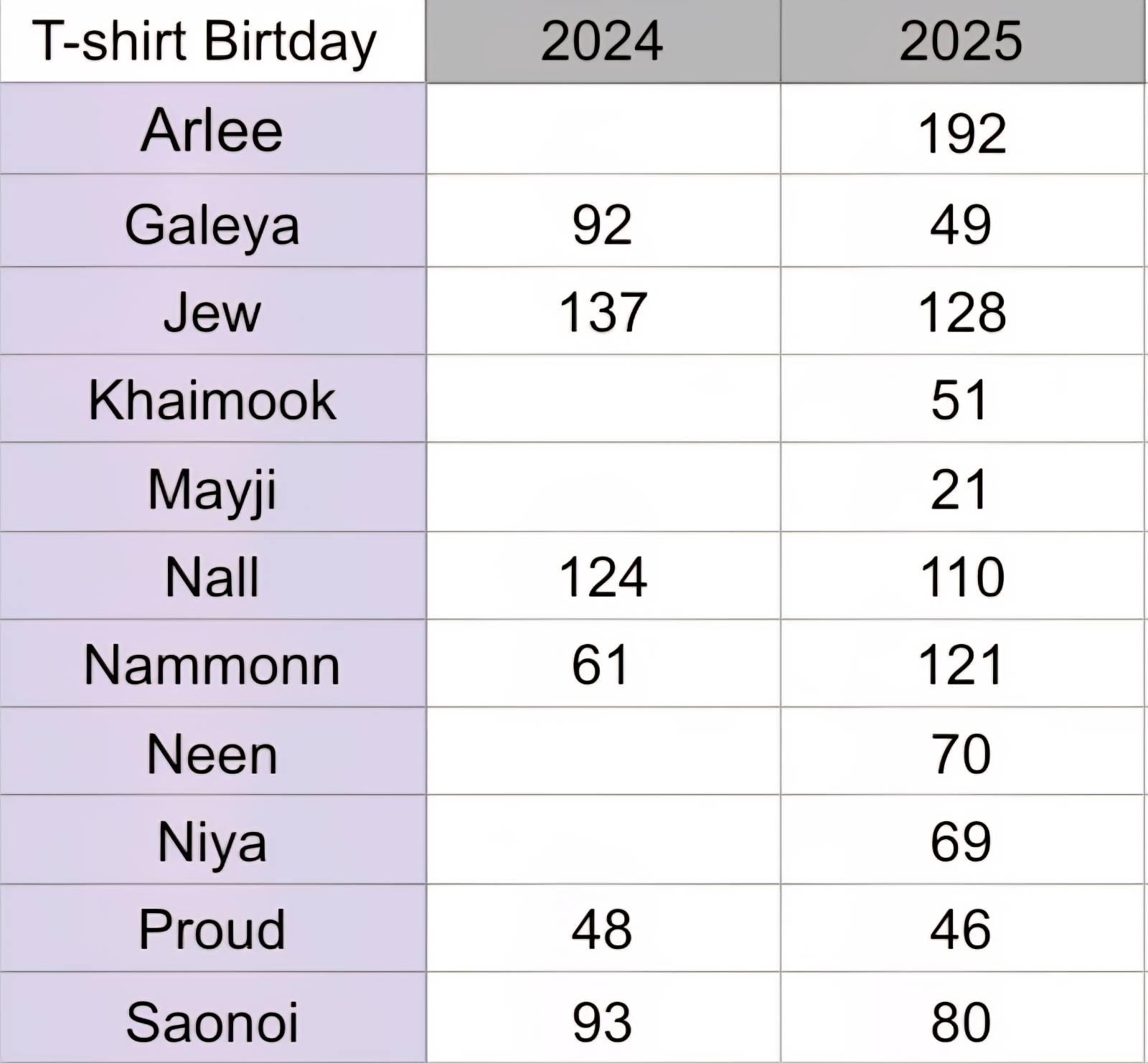 ถ้า 12 คนตามที่หลายคนโพสต์ ก็ขอเดาว่า Niya Arlee Galeya Saonoi Nall Jew Kaimook Mayji Nammon Nana Neen Proud