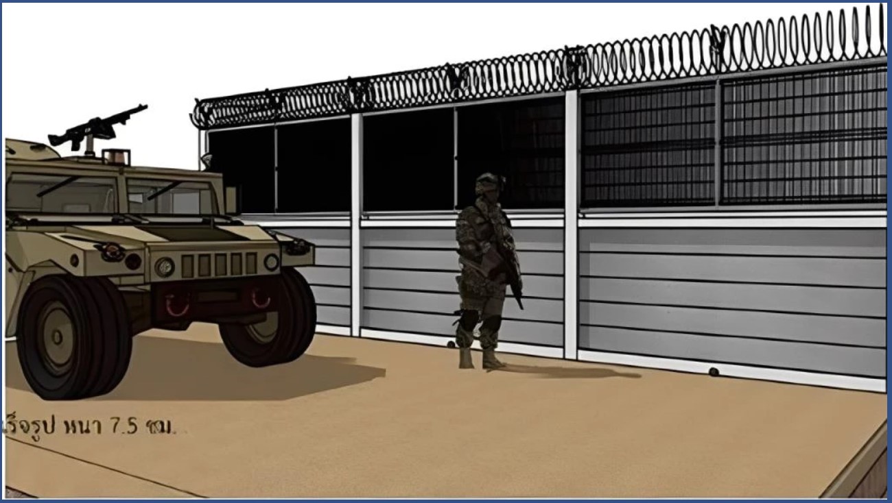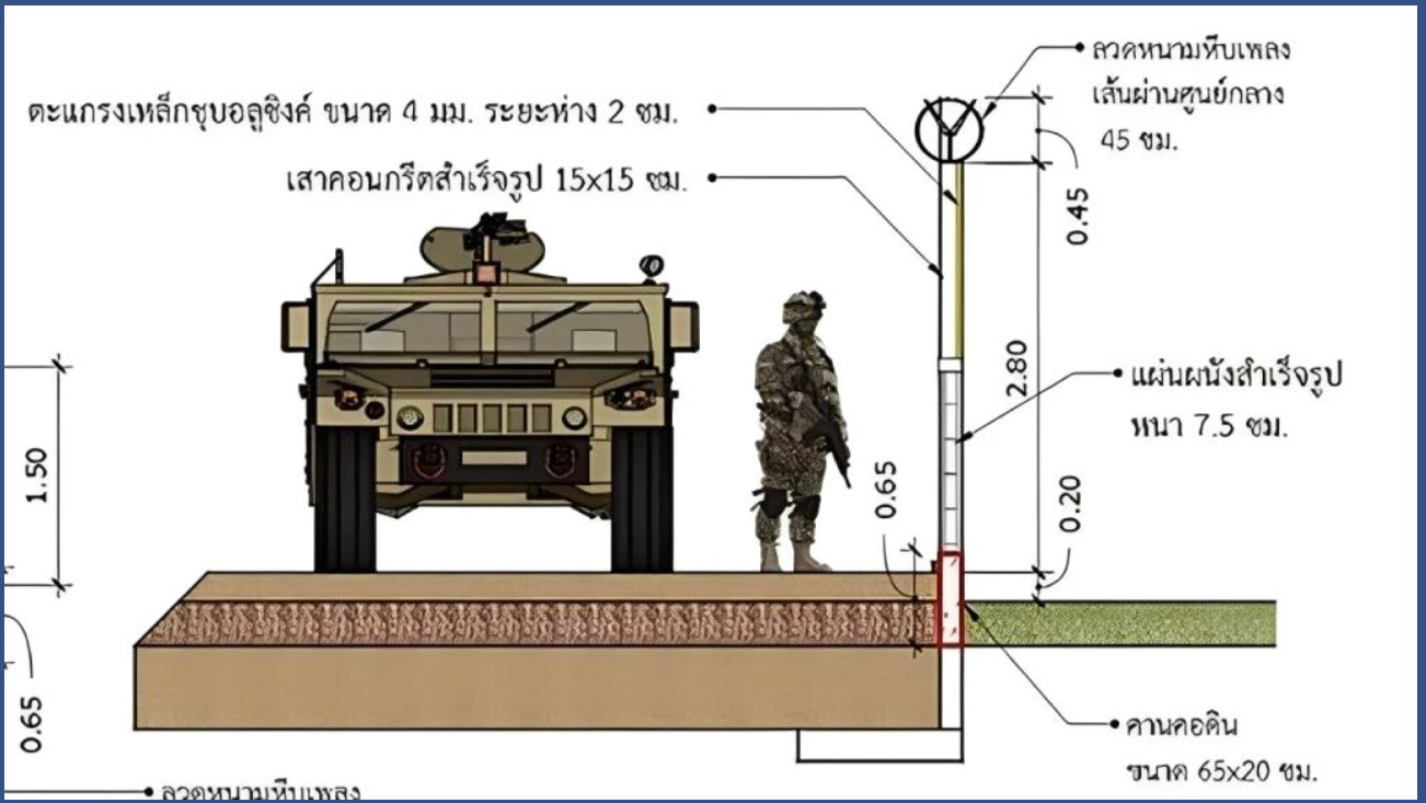 กองทัพไทยเผยแบบรั้วกั้นชายแดนไทย-กัมพูชา เป็นคอนกรีตสำเร็จรูปครึ่งตะแกรงเหล็กชุบอะลูซิงค์ ติดลวดหนามหีบเพลง ก่อสร้างโดยหน่วยทหารพัฒนา พร้อมถนนตรวจการณ์