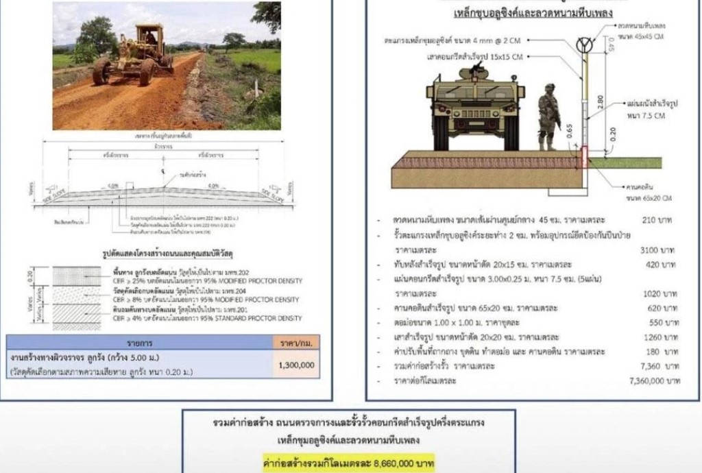 กองบัญชาการกองทัพไทยเปิดเผยรูปแบบกั้นชายแดนไทย-กัมพูชา สร้างโดยหน่วยบัญชาการทหารพัฒนา (นทพ.) กองบัญชาการกองทัพไทย พร้อมถนนตรวจการณ์