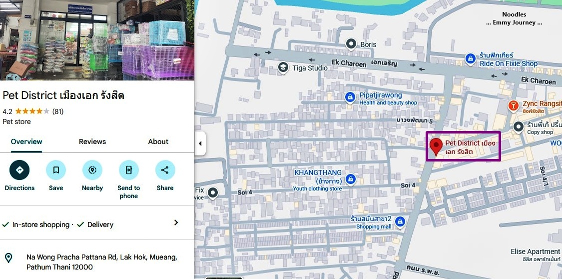 ได้ทานร้านก๋วยเตี๋ยวร้านนี้เพราะแวะไปซื้อของให้น้องแมว ( 2-3 ปี ก่อนไม่มีนะ ร้านเพิ่งมาเปิด) ร้านก๋วยเตี๋ยวตั้งขายอยู่หน้าร้าน Pet Shop ที่ชื่อว่า Pet District เมืองเอก รังสิต ถนนนาวงประชาพัฒนา ตำบลหลักหก จังหวัดปทุมธานี