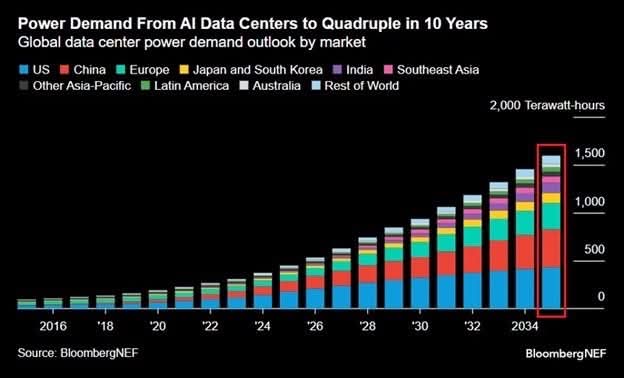 จากข้อมูลของ BloombergNEF จะเห็นว่า “AI ไม่ได้แค่เปลี่ยนโลกของข้อมูล แต่มันกำลังพลิกโครงสร้างของพลังงานทั้งโลก”