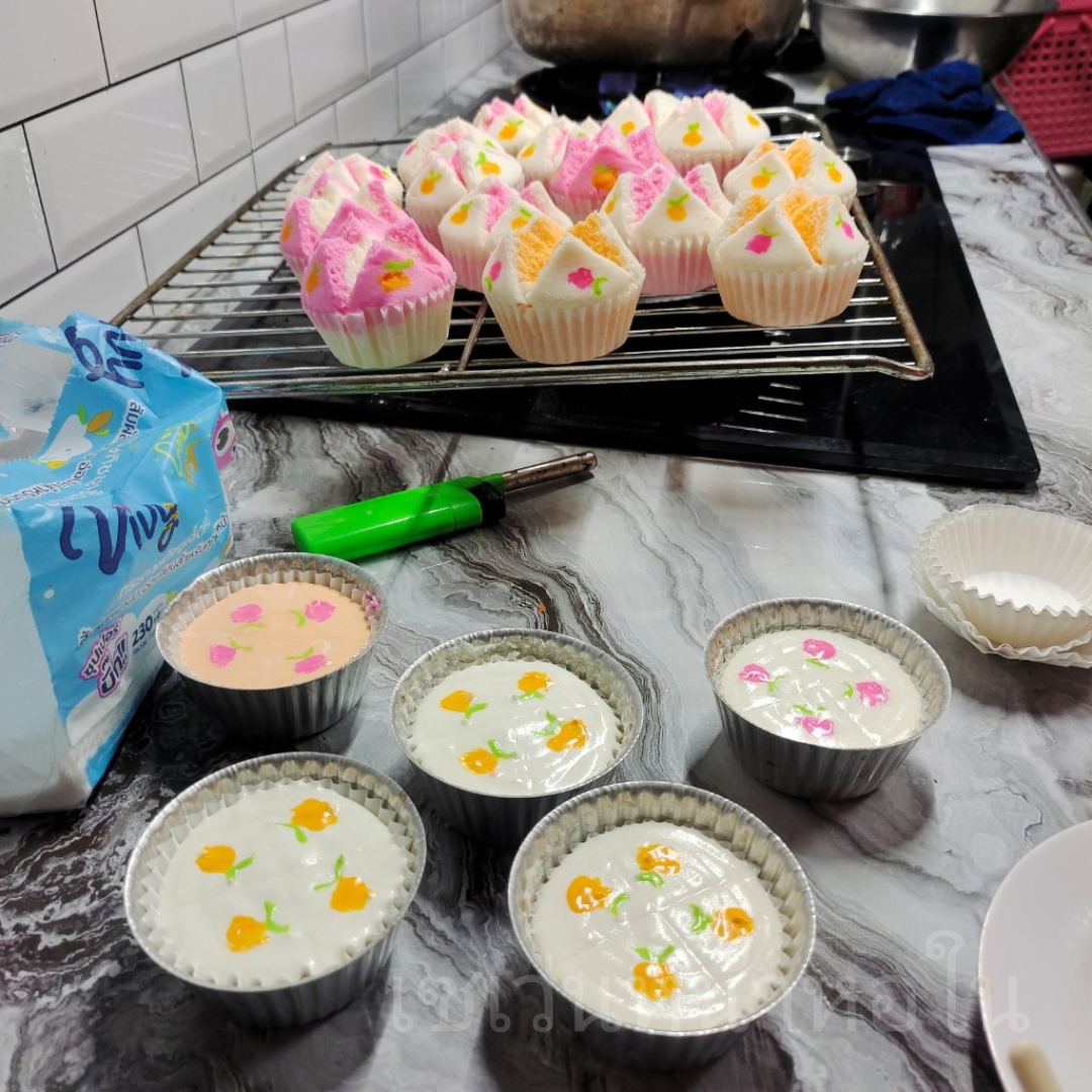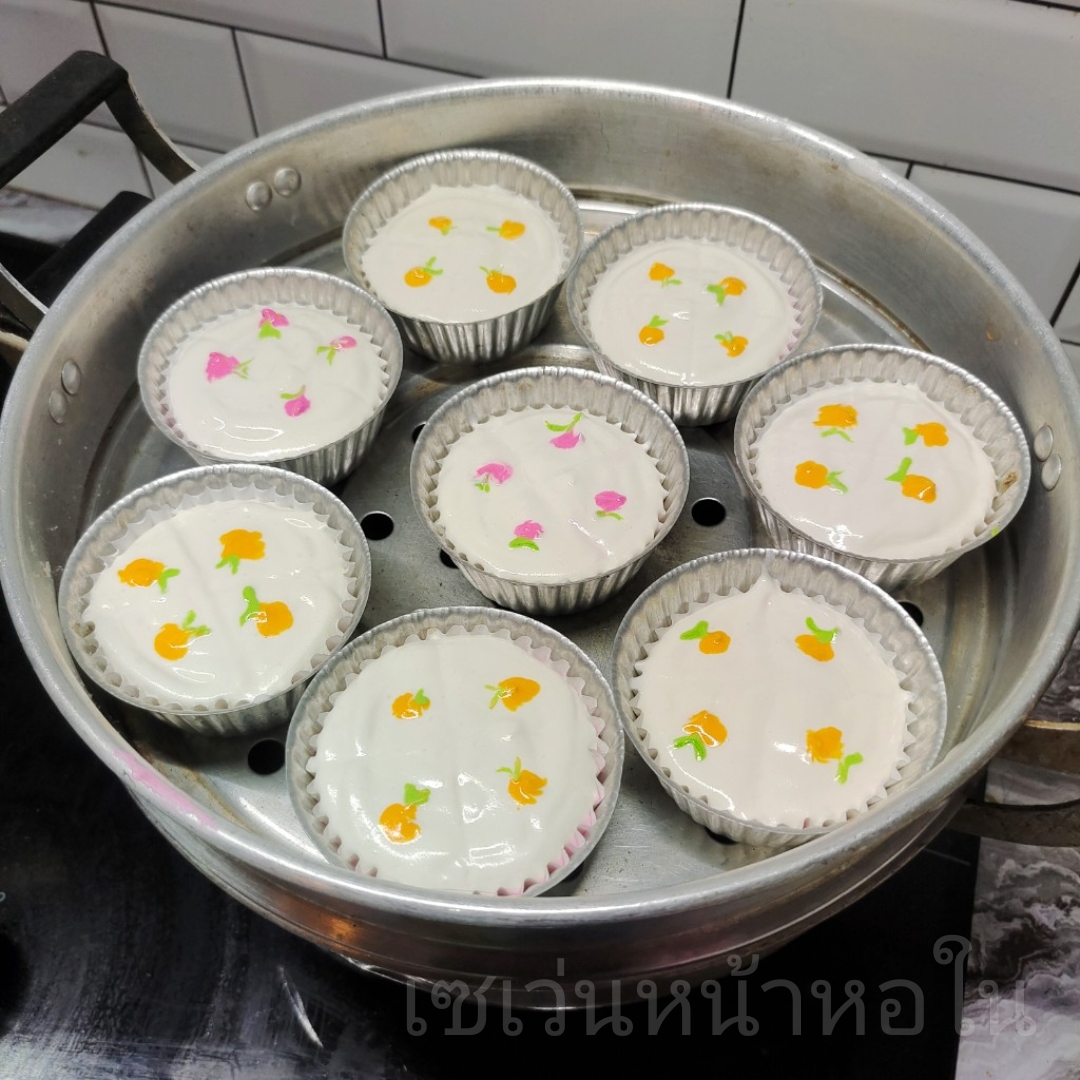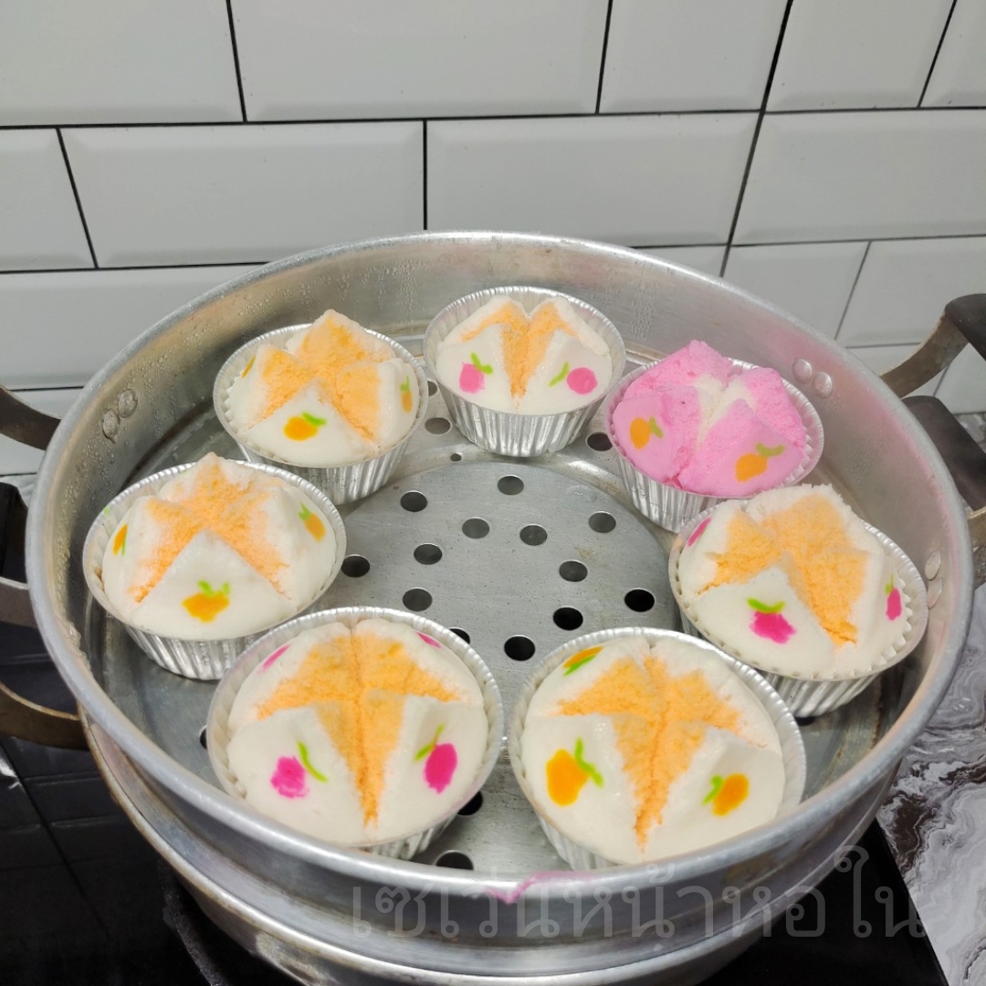 เตาแรก นึ่งออกมาหน้าขนมยังแตกได้ไม่สวย แก้มื่อใหม่ ถาดนี้เอาไว้ชิมกันเอง