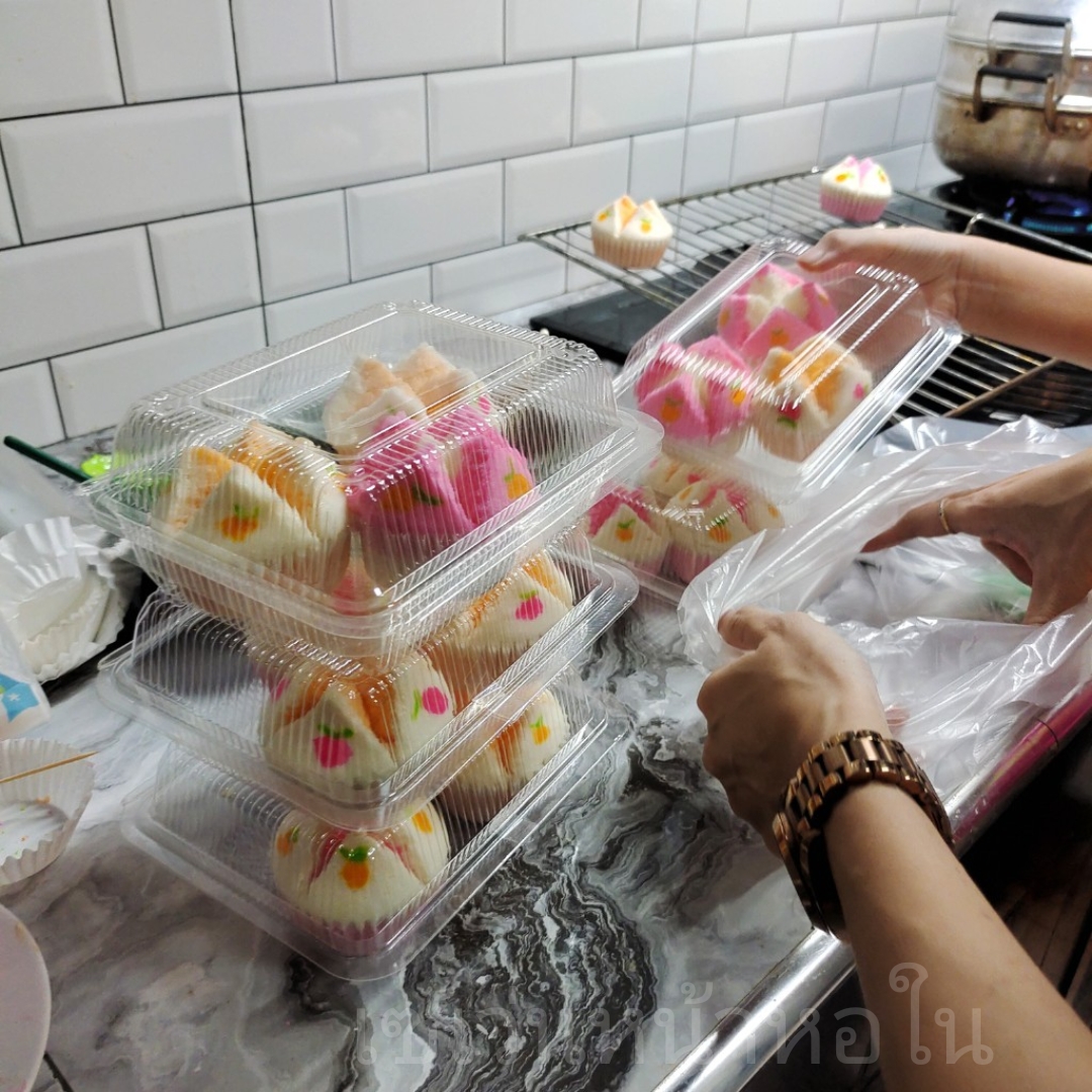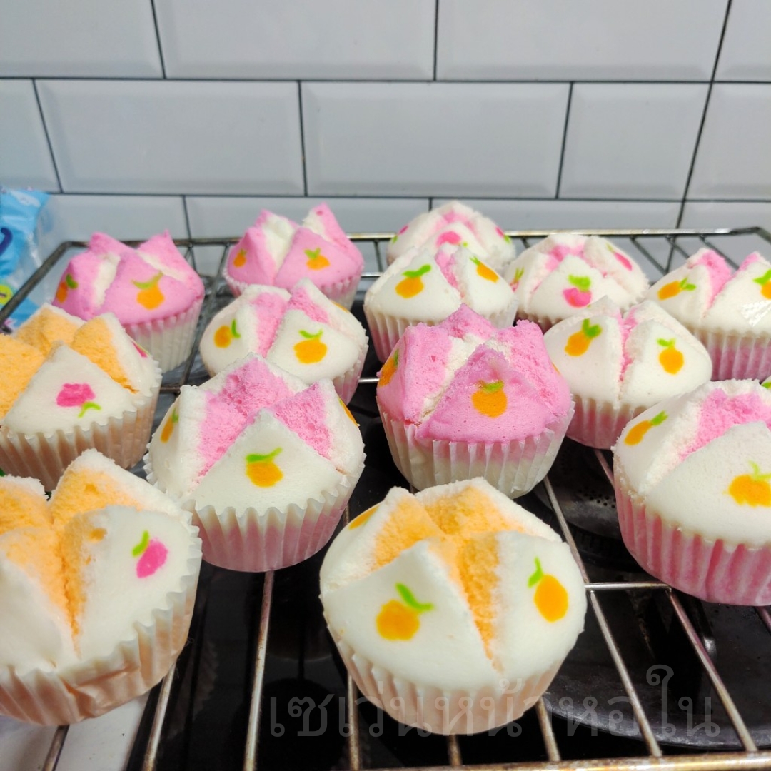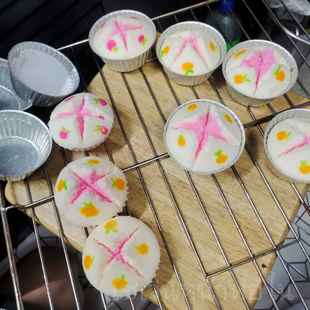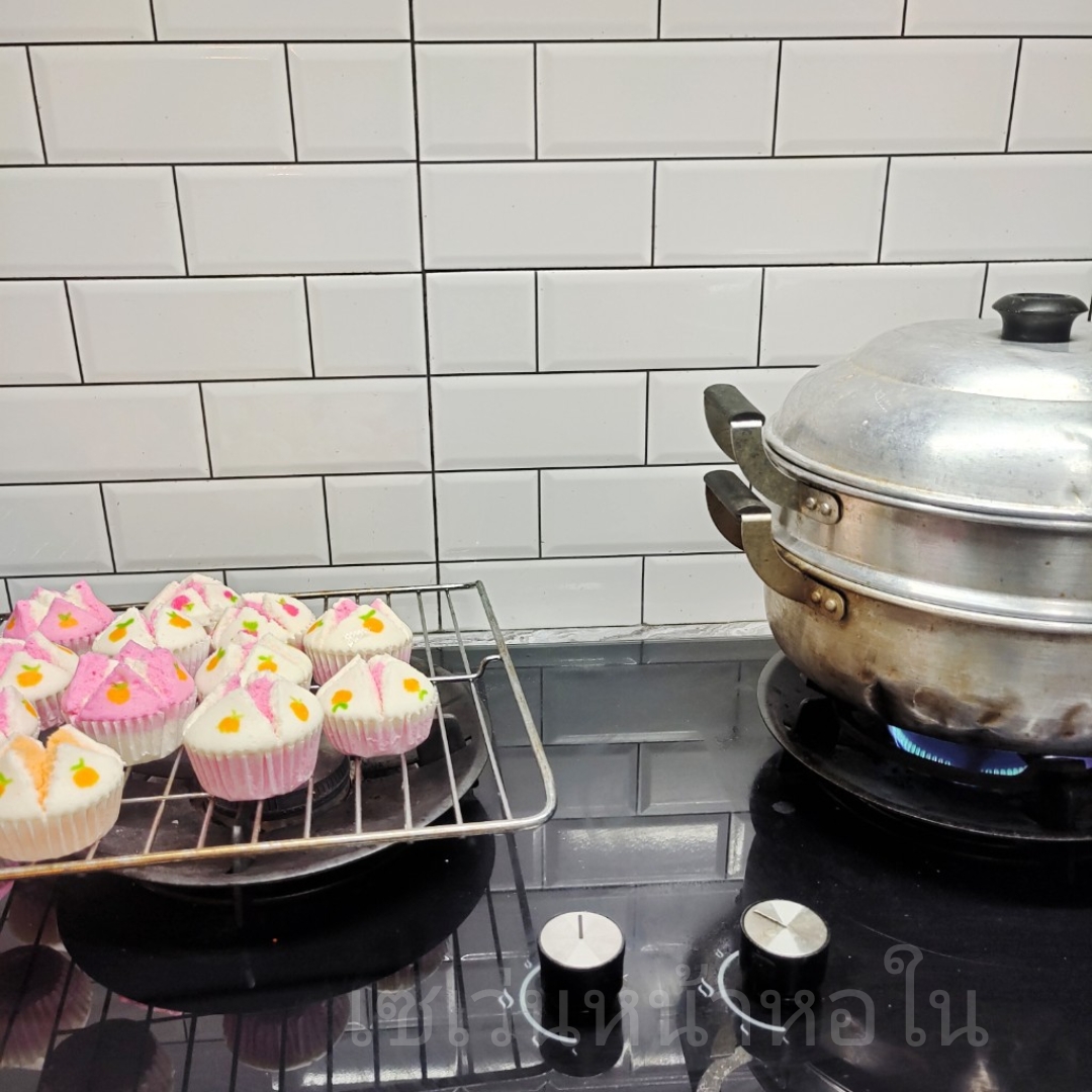 เตาแรก นึ่งออกมาหน้าขนมยังแตกได้ไม่สวย แก้มื่อใหม่ ถาดนี้เอาไว้ชิมกันเอง