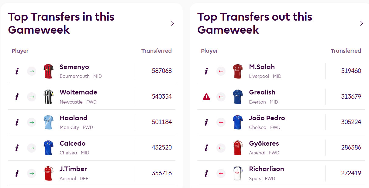 ตัวจริง จอช คิง (ฟูแลม), บรูโน่ เฟอร์นันเดส (แมน ยูไนเต็ด), เซเมนโย (บอร์นมัธ), ซาลาห์ (ลิเวอร์พูล), ไคเซโด (เชลซี)