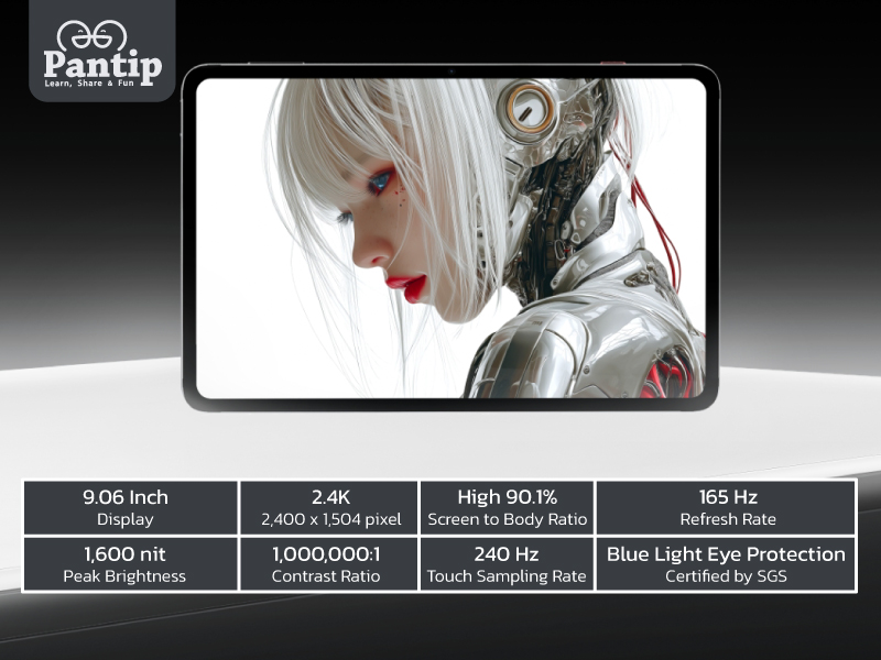 หน้าจอเป็น OLED ขนาดใหญ่สะใจ 9.06 นิ้ว มาพร้อมขอบบางเฉียบแค่ 4.9 มม. อัตราส่วนหน้าจอต่อตัวเครื่องที่ 90.1% มาเหนือกว่าคู่แข่ง ความละเอียดระดับ 2.4K (2,400 x1,504) ให้ภาพคมกริบเหมือนยกโรงหนังมาไว้ในมือ รีเฟรชเรทจัดเต็ม 165Hz มาพร้อม Magic Touch 240Hz ตอบสนองไวปุ๊บปั๊บ เล่นเกมลื่นไหลไม่มีสะดุด ความสว่างสูงสุด 1,600 นิต มองเห็นได้ชัดเจนแม้อยู่กลางแจ้ง ให้มาตราฐานสี DCI-P3 ได้ครอบคลุม พร้อมความแม่นยำ ΔE≈0.7 ทำให้ได้สีที่สวยสมจริง อัตราส่วนคอนทราสต์ 1,000,000:1 และยังผ่านการรับรอง Blue Light Eye Protection จาก SGS ช่วยถนอมสายตาอีกด้วย