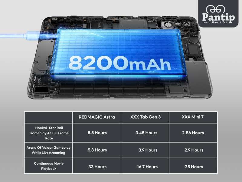 ส่วนแบตเตอรี่มีความจุ 8,200 mAh ใหญ่ที่สุดในบรรดาแท็บเล็ตไซซ์ใกล้เคียงกัน ใช้ได้ยาวแบบไม่ต้องห่วงว่าแบตจะหมดง่ายๆ แล้วจากการทดสอบสามารถเล่นเกม Honkai: Star Rail ได้ต่อเนื่องถึง 5.5 ชั่วโมง, เล่นเกมพร้อมสตรีม Arena of Valor ได้ยาวๆ 5.3 ชั่วโมง หรือถ้าใครสายดูหนัง สามารถดูมาราธอนได้นานถึง 33 ชั่วโมงเลยทีเดียว ที่สุดยอดกว่านั้น คือระบบชาร์จเร็ว สามารถชาร์จแบตจาก 0–100% ได้ในเวลาเพียง 71 นาที มาพร้อมเทคโนโลยีการแยกประจุขั้นสูงที่ช่วยถนอมสุขภาพแบต ใช้ไปนานๆ ก็ยังสบายใจได้