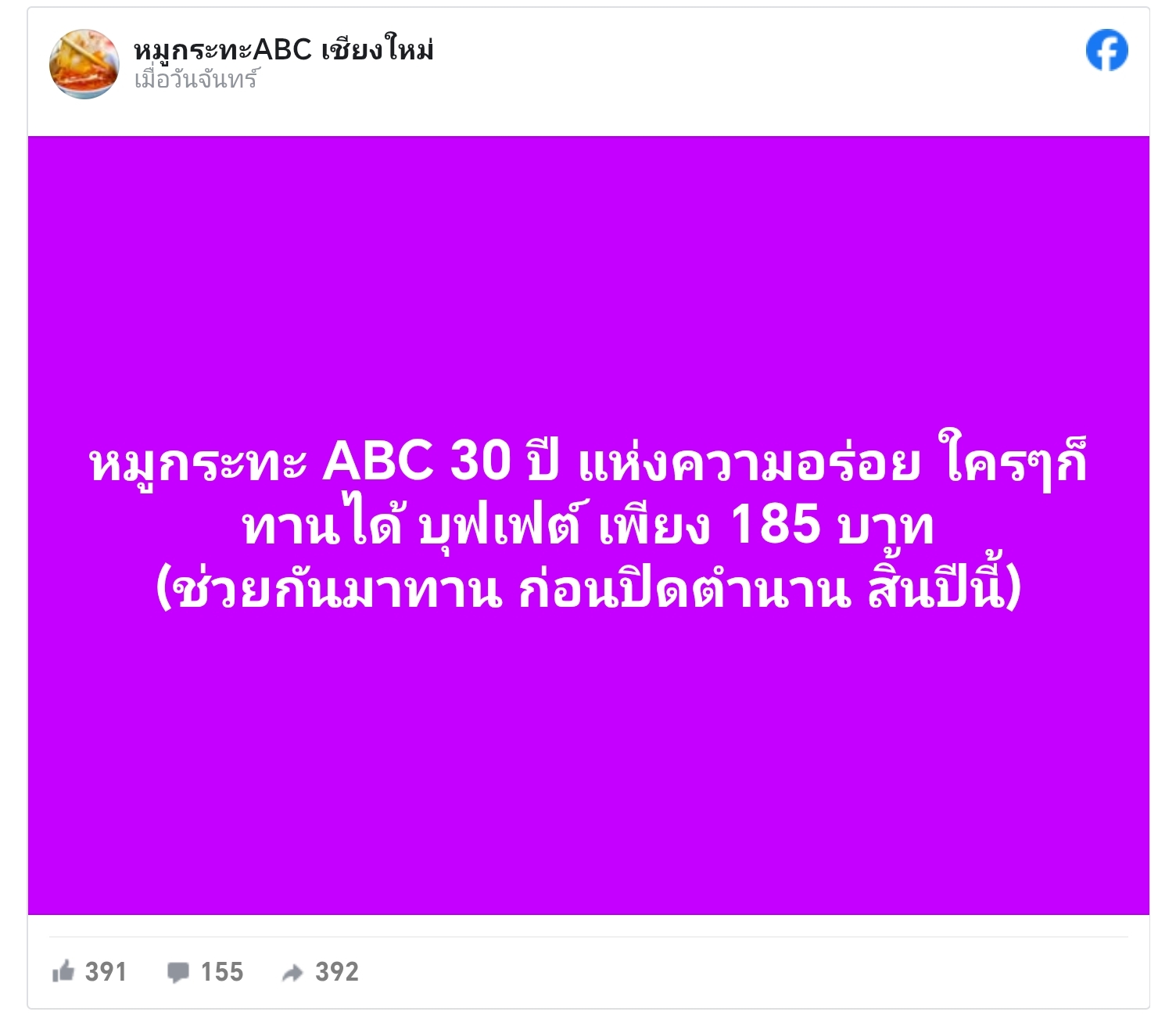 วันที่ 15 ต.ค. 2568 มีรายงานว่า เฟซบุ๊ก หมูกระทะABC เชียงใหม่ ได้โพสต์ข้อความโดยระบุว่า "หมูกระทะ ABC 30 ปี แห่งความอร่อย ใครๆ ก็ทานได้ บุฟเฟต์เพียง 185 บาท ช่วยกันมาทานก่อนปิดตำนานสิ้นปีนี้"