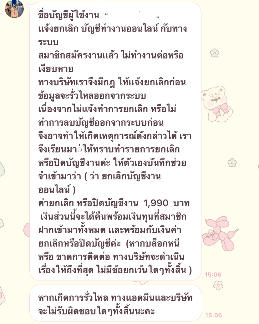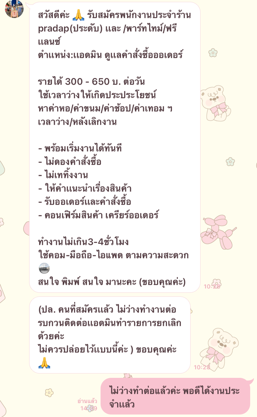 หนูลองทำครั้งเเลกโดยการโอนเงิน 190 ซึ่ง ก็ทำได้ เเต่ถอนไม่ได้ หนูเลยเอะใจเเละตัดสินใจไม่ทำต่อ เพราะทางเเอดมินทักมาบอกว่าต้องเติมเงินเพิ่ม เเต่วันนี้เขาทักมาเเบบนี้ คือเขาจะดำเนินาการจริงไหมคะ