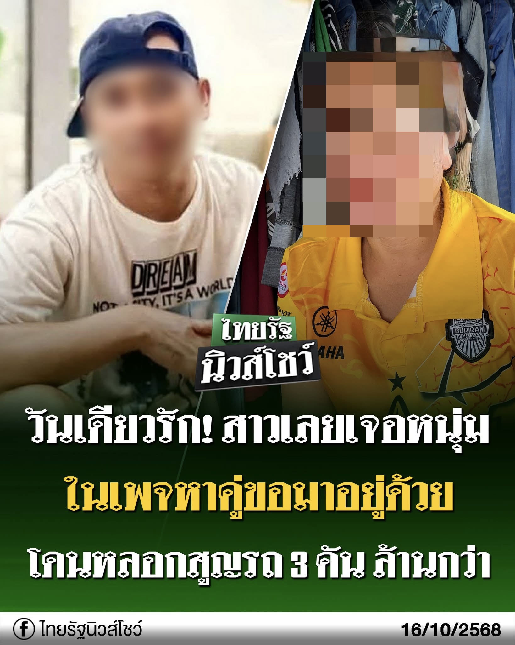 16 ตุลาคม 2568 นางสาววัชลาพร อายุ 32 ปี ชาวจังหวัดเลย ได้เข้าร้องเรียนต่อผู้สื่อข่าว หลังถูก นายธวัชชัย อายุ 41 ปี ชาว จ.สระแก้ว หลอกลวงผ่านเพจหาคู่จนสูญเสียรถกระบะ 2 คัน และรถจักรยานยนต์ 1 คัน รวมมูลค่ากว่า 1.2 ล้านบาท