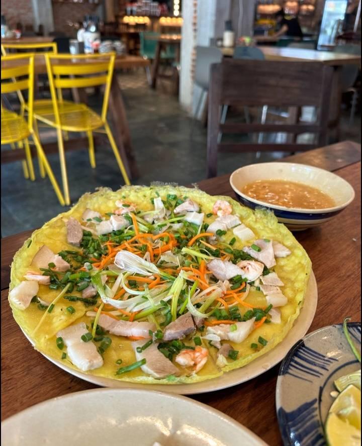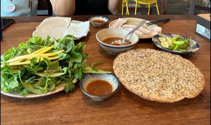 เมนูที่เรากินก็จะมีแหนมเนืองหมูสามชั้น ที่ทางร้านให้ผักมาเป็นกระบุง ใครที่ชอบผักบอกเลยว่าถูกใจแน่นอนค่ะ แล้วอีกอย่างแผ่นแป้งที่ใช้ห่อก็ไม่ต้องจุ่มน้ำก่อนด้วย นอกจากแหนมเนืองแล้วก็มีเมนูแป้งทอดแผ่นกลม ๆ ค่ะ เราไม่รู้ว่ามันเรียกว่าอะไร ข้างบนโรยด้วยกุ้งกับหอม 2 อย่างนี้อิ่มมาก ตีเป็นเงินไทยก็ประมาณคนละไม่เกิน 200 บาท