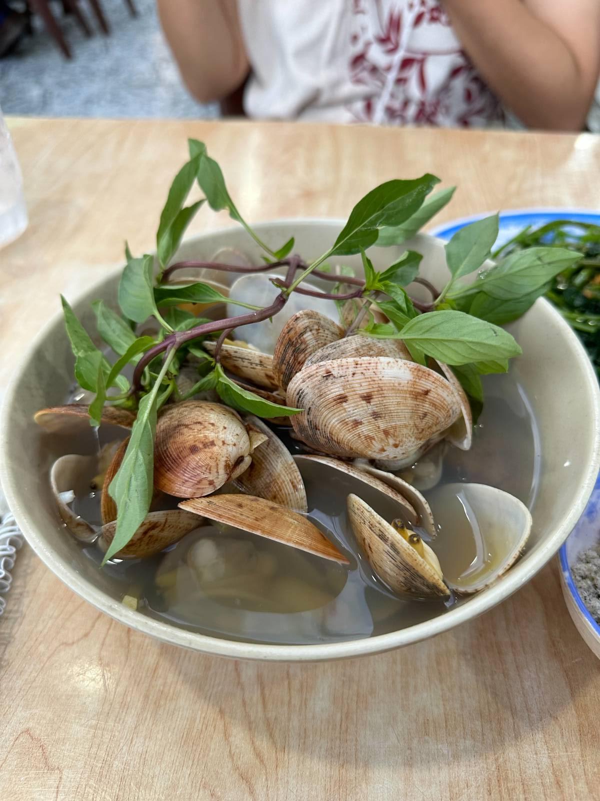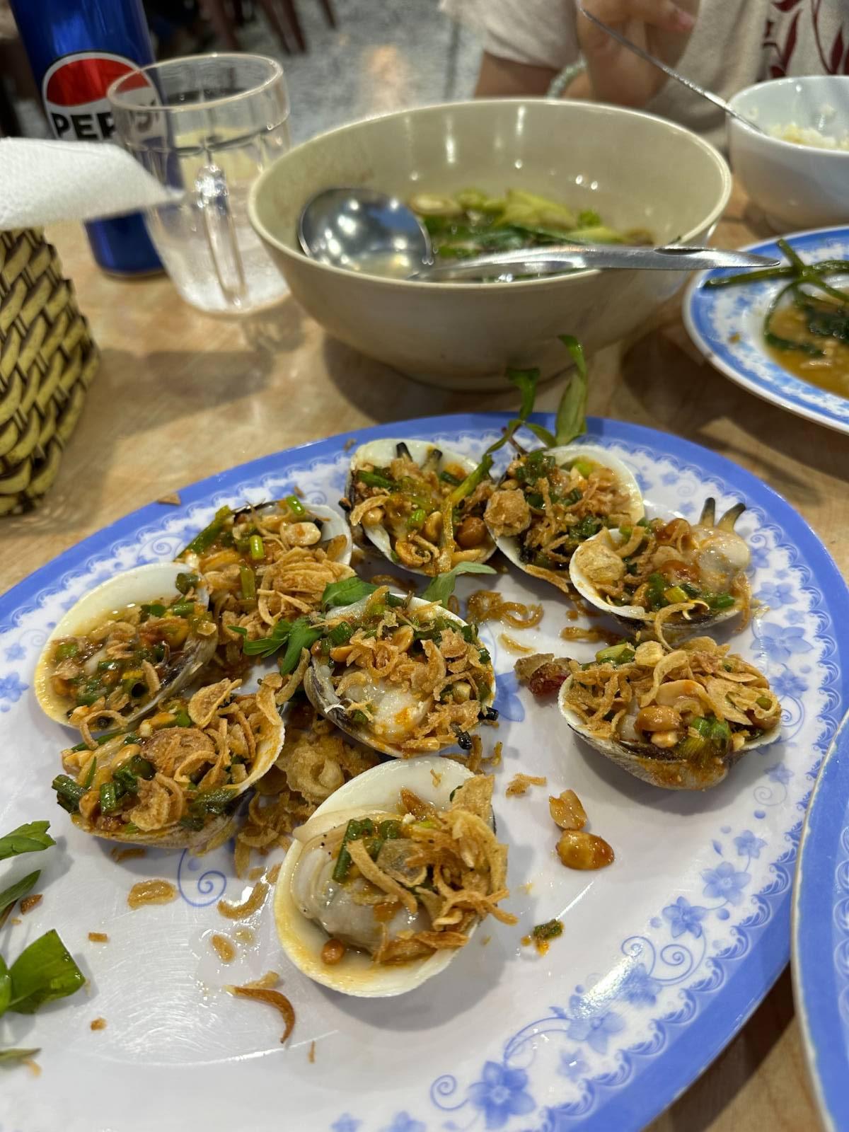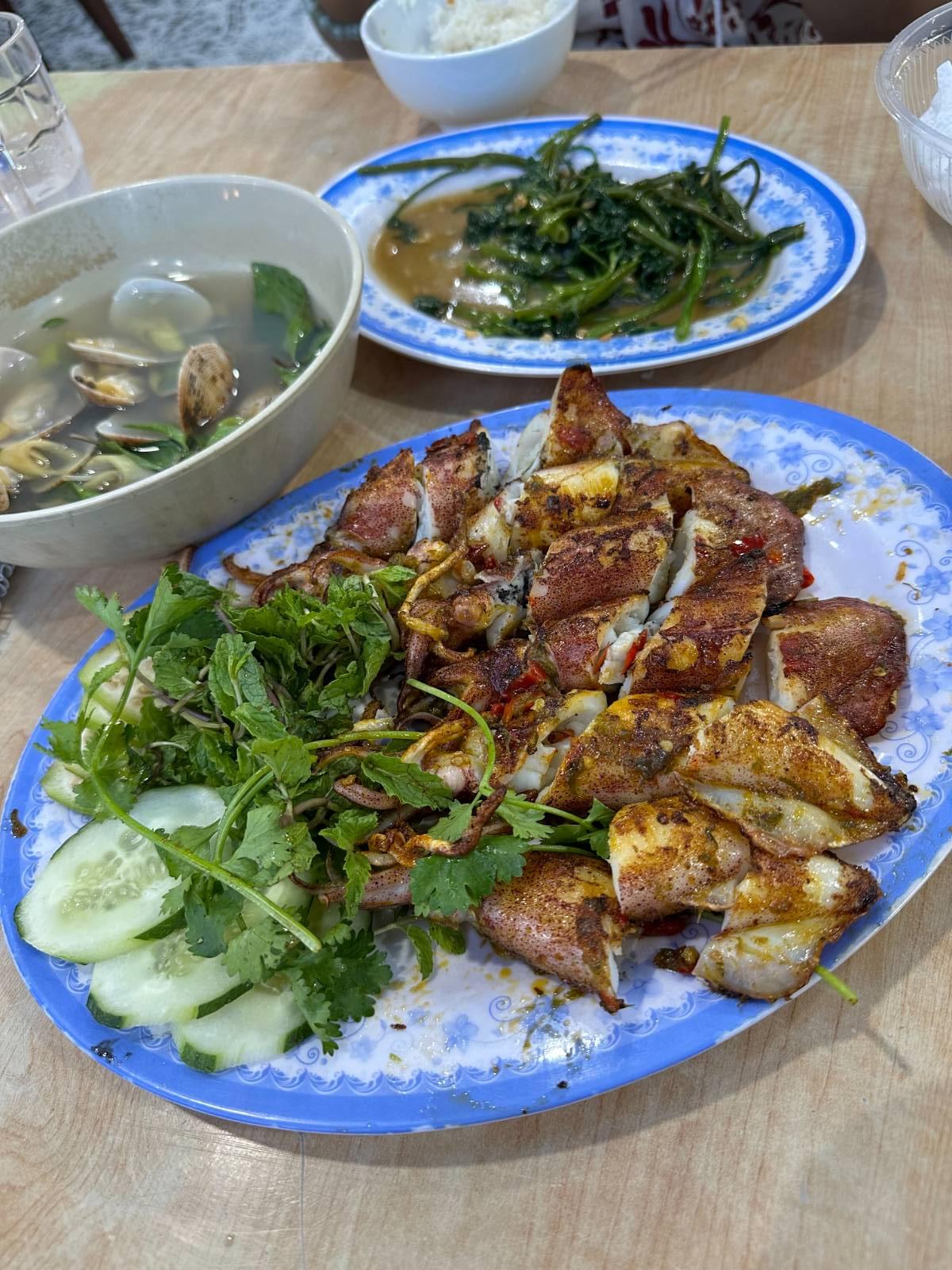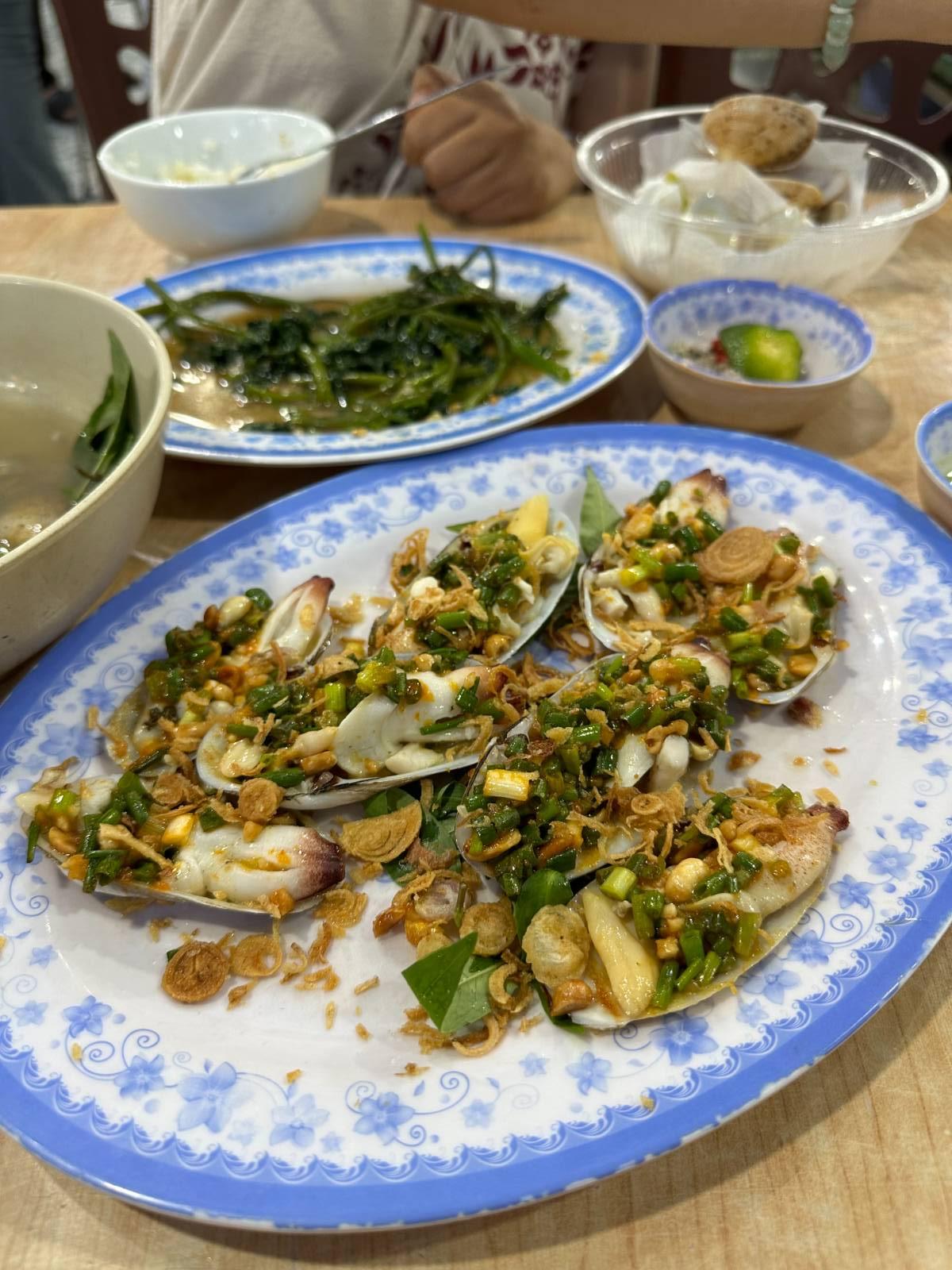 และนี่เป็นอาหารเย็นที่เวียดนามมื้อสุดท้าย เป็นอาหารทะเลทั้งหมดเพราะเราไปพักบริเวณหาดหมีเคว อาหารทะเลที่นั่นสดมากกกก เราสั่งมาทั้งหมด 5 อย่าง หมดไปประมาณคนละ 700 บาท เกือบกินไม่หมดแหนะ แกงหอยดูจืดจางแต่จริงๆแล้วอร่อยโคตร หอยย่างก็รสชาติเหมือนคอหมูย่างเลย เราแอบงง แต่อร่อย 55555555