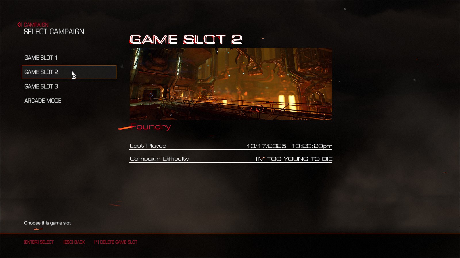 ตอนนี้ผมโหลดDoom(2016)กลับมาเล่นอีกครั้ง แล้วผมอยากจะเล่นมันตั้งแต่เริ่มเกมแรก หรือ เรียกว่า"เริ่มใหม่"ผมอยากรู้วิธีลบ Game Slot สัก1อันครับ