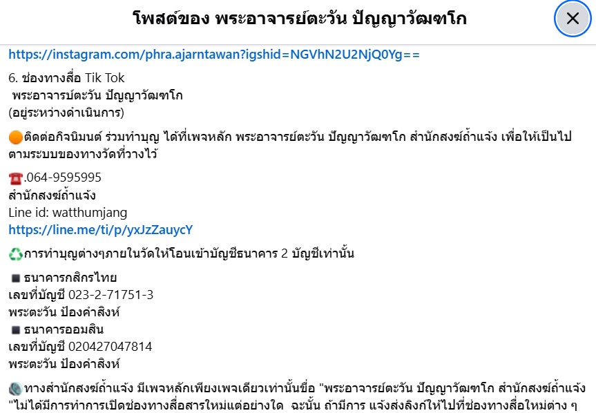 การทำบุญกับสำนักสงฆ์ถ้ำแจ้ง ต้องโอนเงินเข้าบัญชีของพระอาจารย์ตะวัน เท่านั้น!