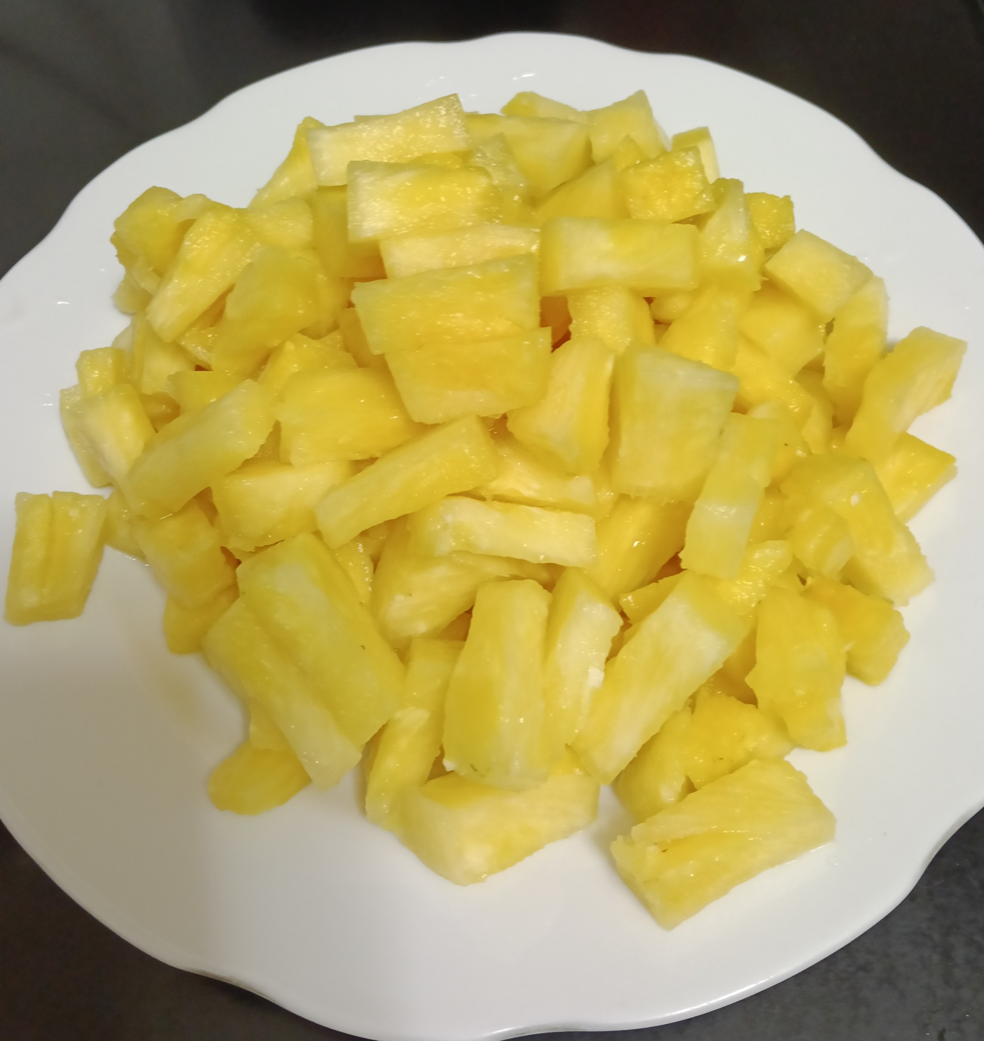 ปอกและหั่นสับปะรดเตรียมไว้ ซึ่งสับปะรดจะน้ำเยอะอยู่แล้ว จขกท จะล้างทำความสะอาดแล้วกรองเอาแต่เนื้อสับปะรด