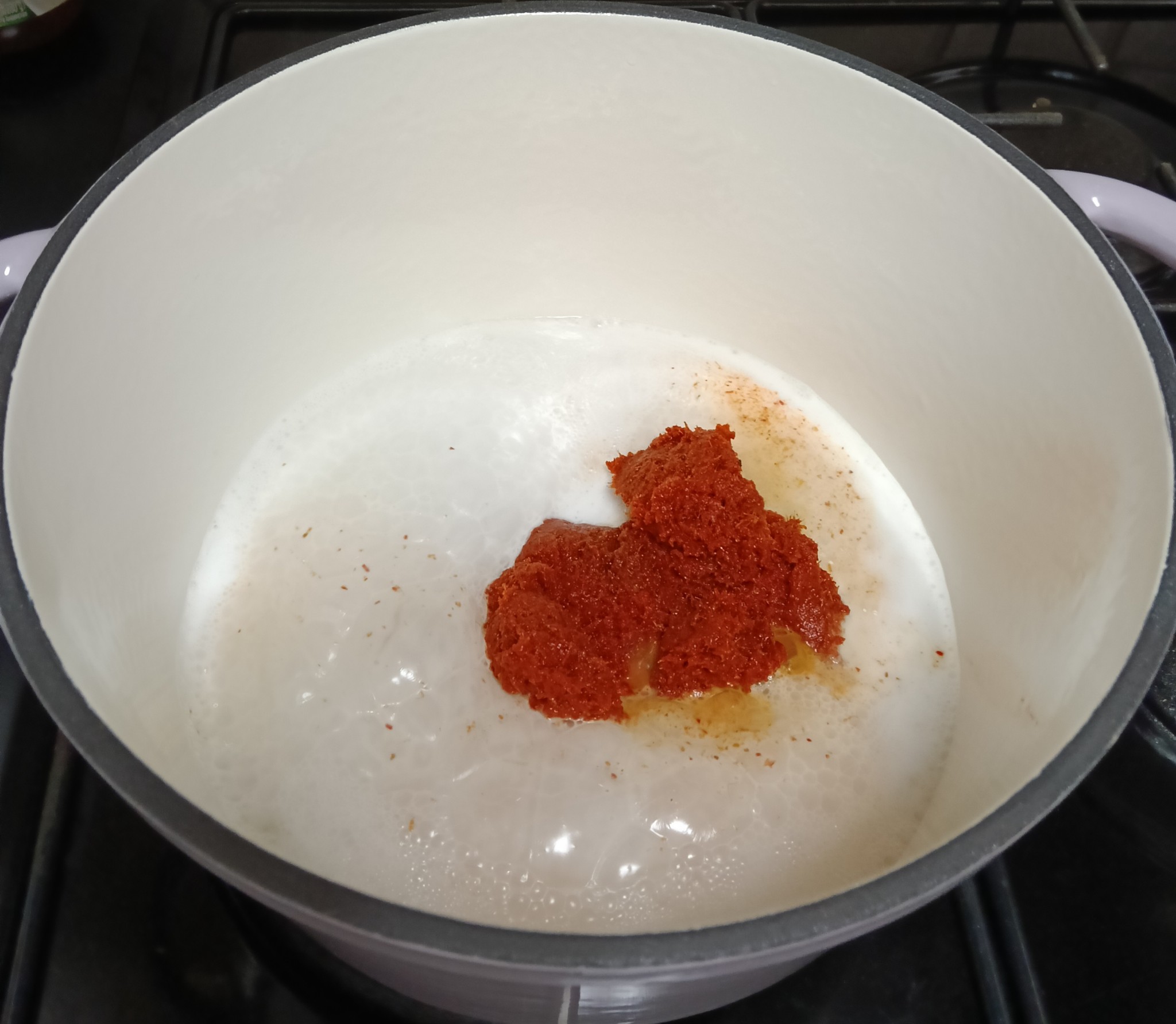 ตั้งหม้อ ใส่กะทิ รอกะทิเดือดแล้วใส่พริกแกงลงไปผัดให้หอม