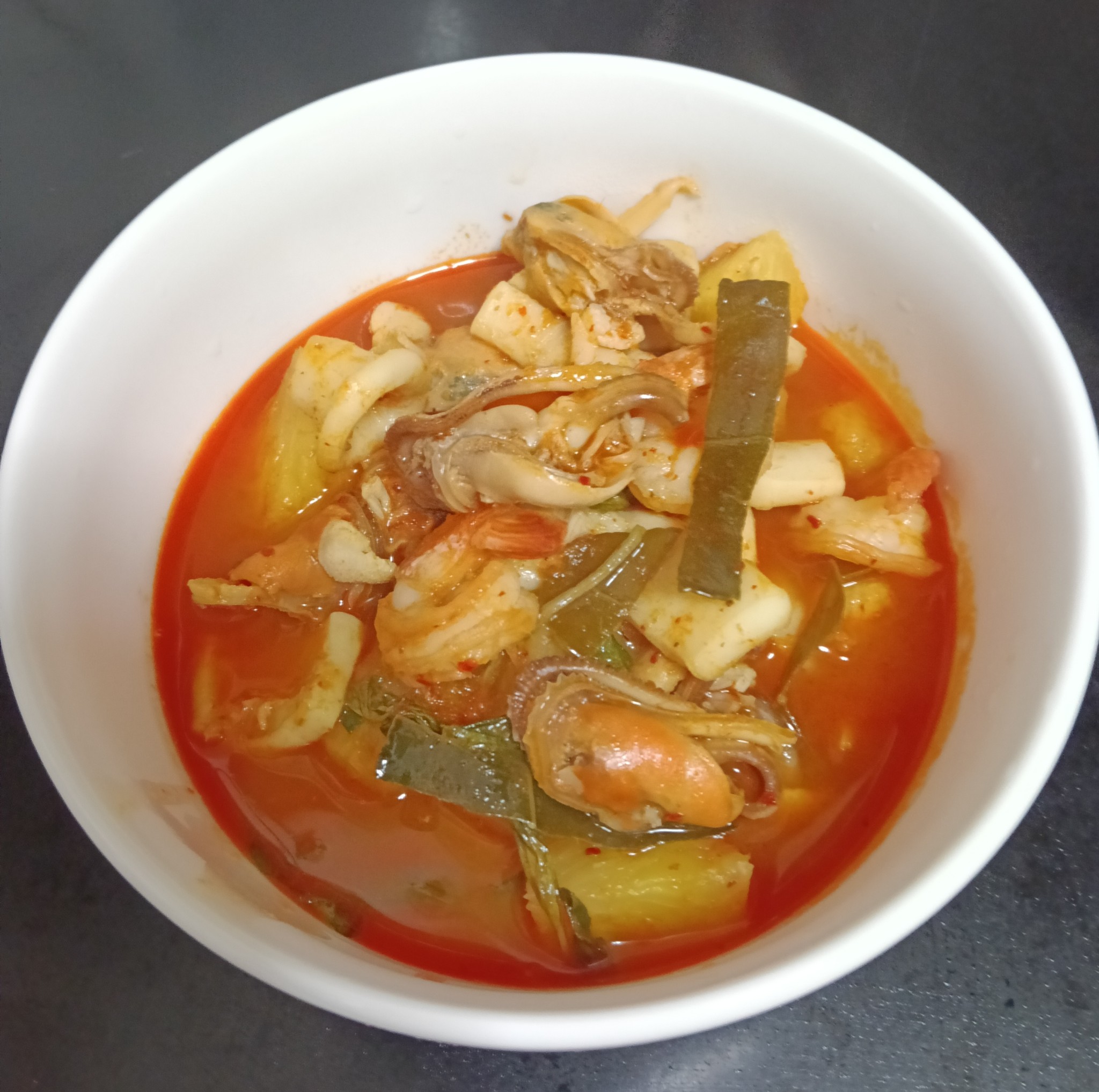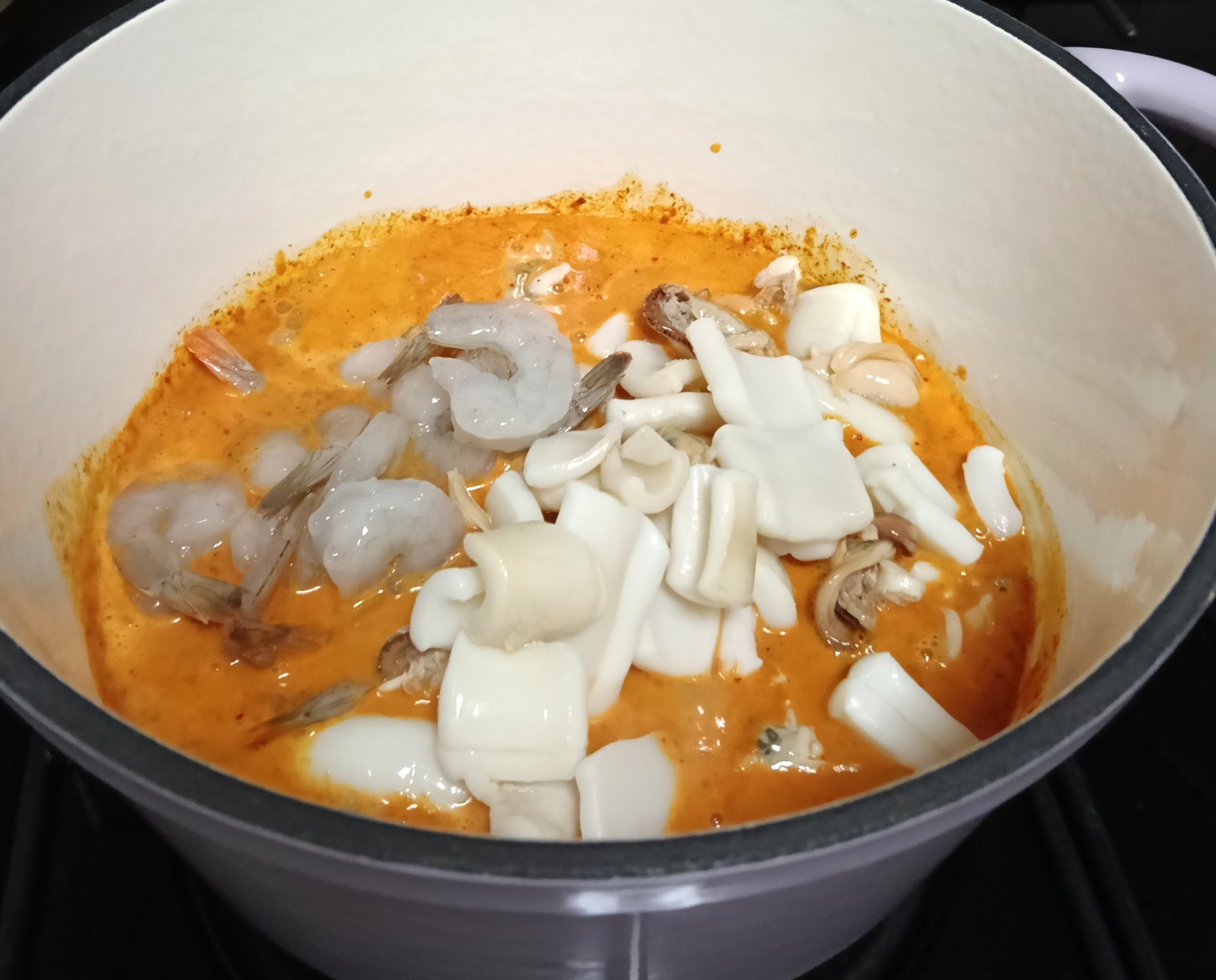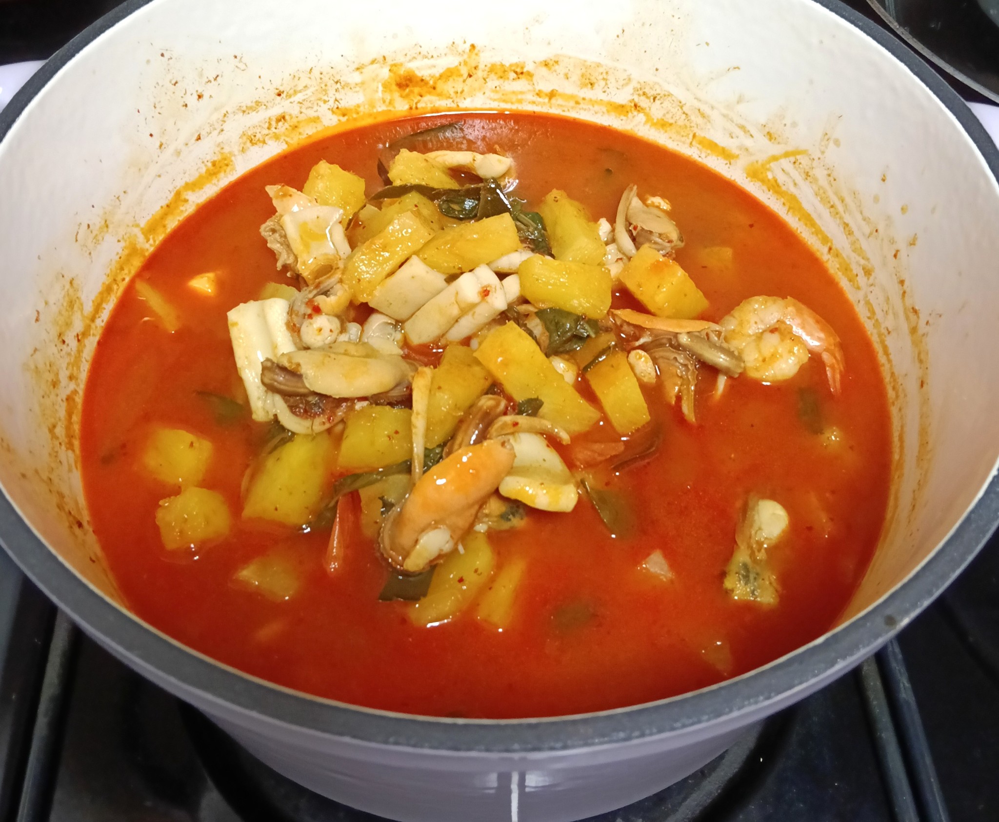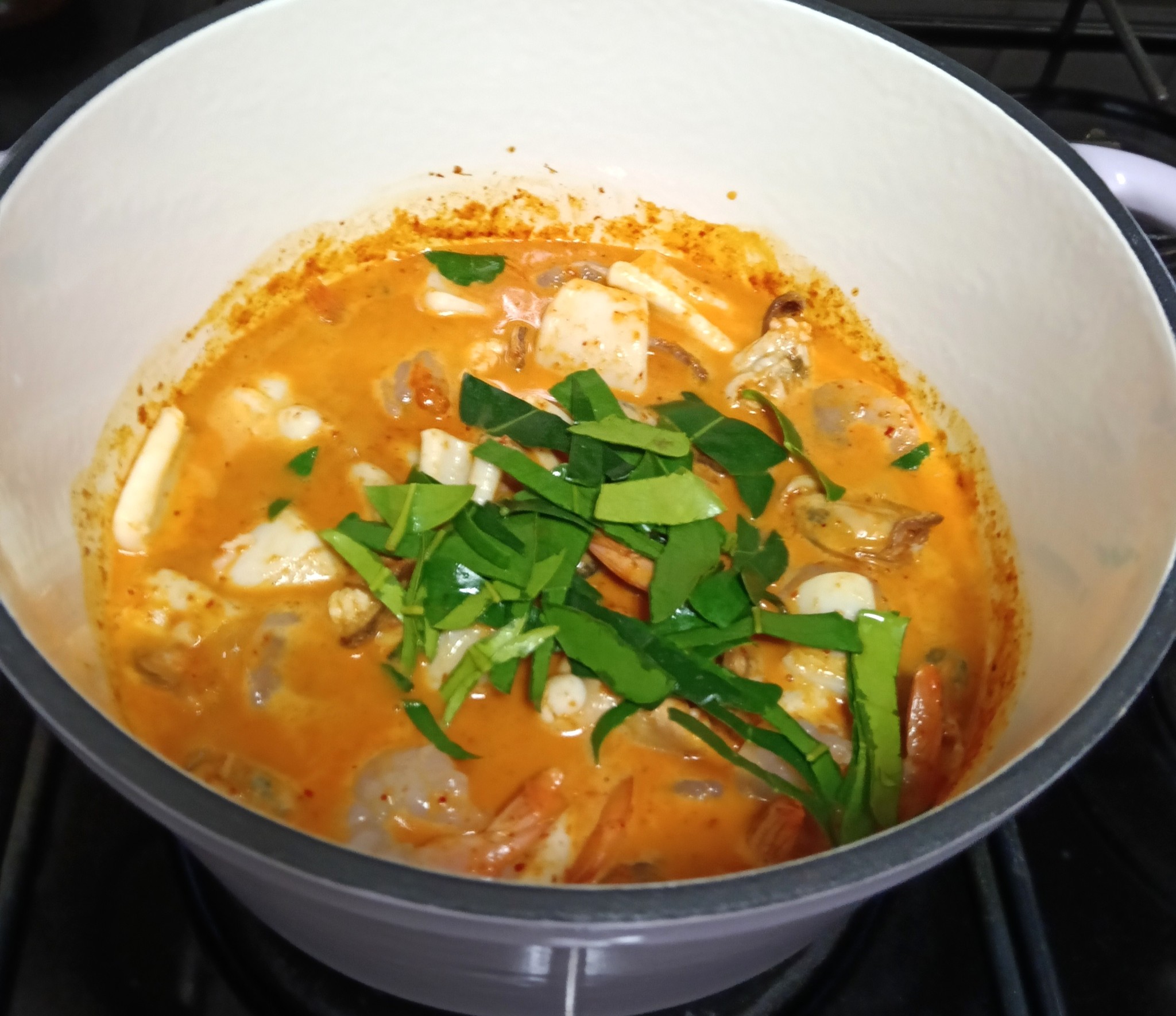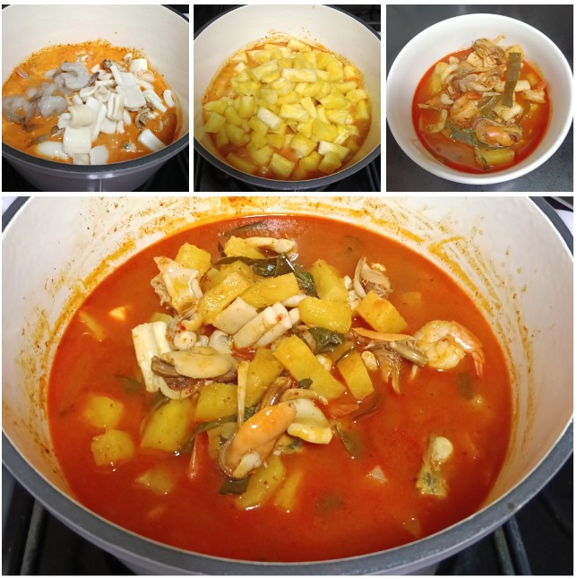 ใส่หอยแมลงภู่ กุ้ง ปลาหมึก ลงไป แล้วตามด้วยใบมะกรูด ใส่กะทิที่เหลือลงไป แล้วตามด้วยสับปะรด