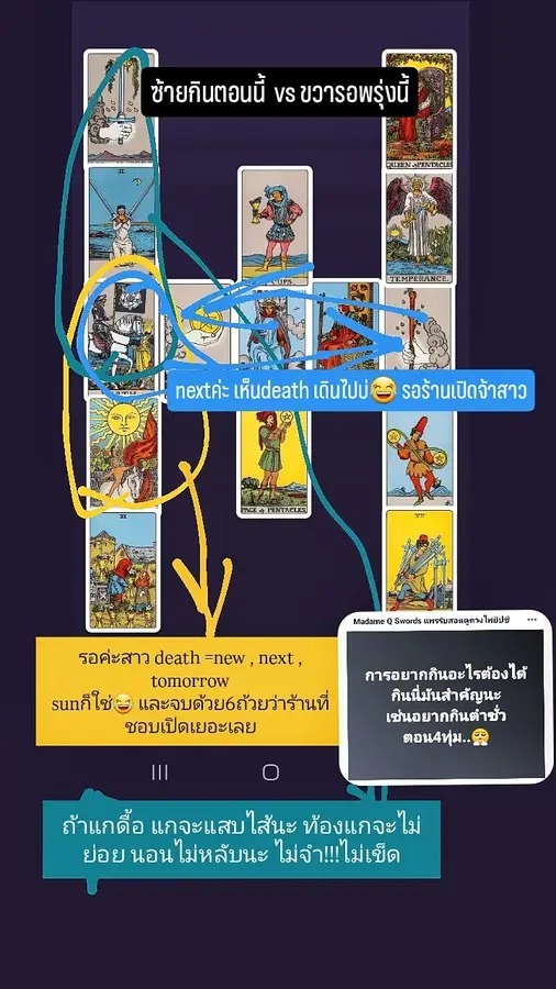 • ในฝั่งแถวซ้ายมือที่จะมีไพ่ death ไพ่ the sun และไพ่6ถ้วยเหมือนอย่างที่แพรเขียนในรูปเลยค่ะว่า มันง่ายมากๆแค่รอเปิดในวันพรุ่งนี้ รวมถึง 6 ถ้วยก็จะเป็นสิ่งที่เรารักเราชอบอยู่แล้วก็เลยตีแทนความได้ว่าร้านประจำร้านโปรดหรือเป็นเมนูประจำเมนูโปรดให้ด้วยเหมือนกันค่ะ