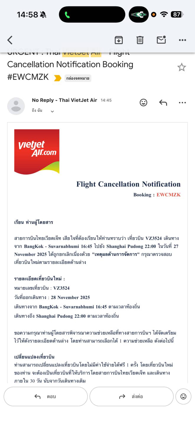 คือวันนี้ได้รับเมลเตือนมาว่าเที่ยว บินถูกยกเลิกวันที่จะเดินทางเลื่อนไปเป็นอีกวันนึงเวลาเดียวกัน