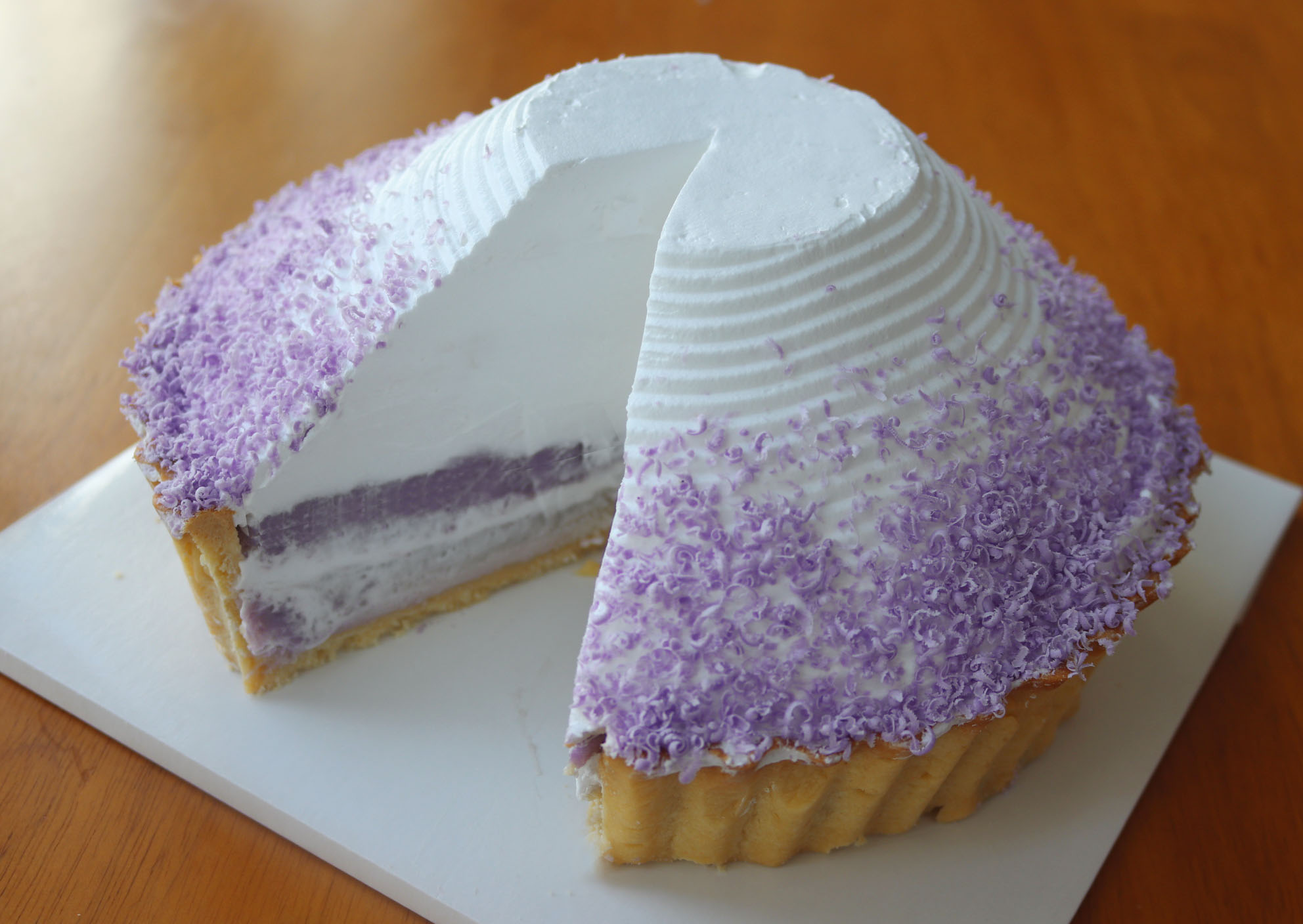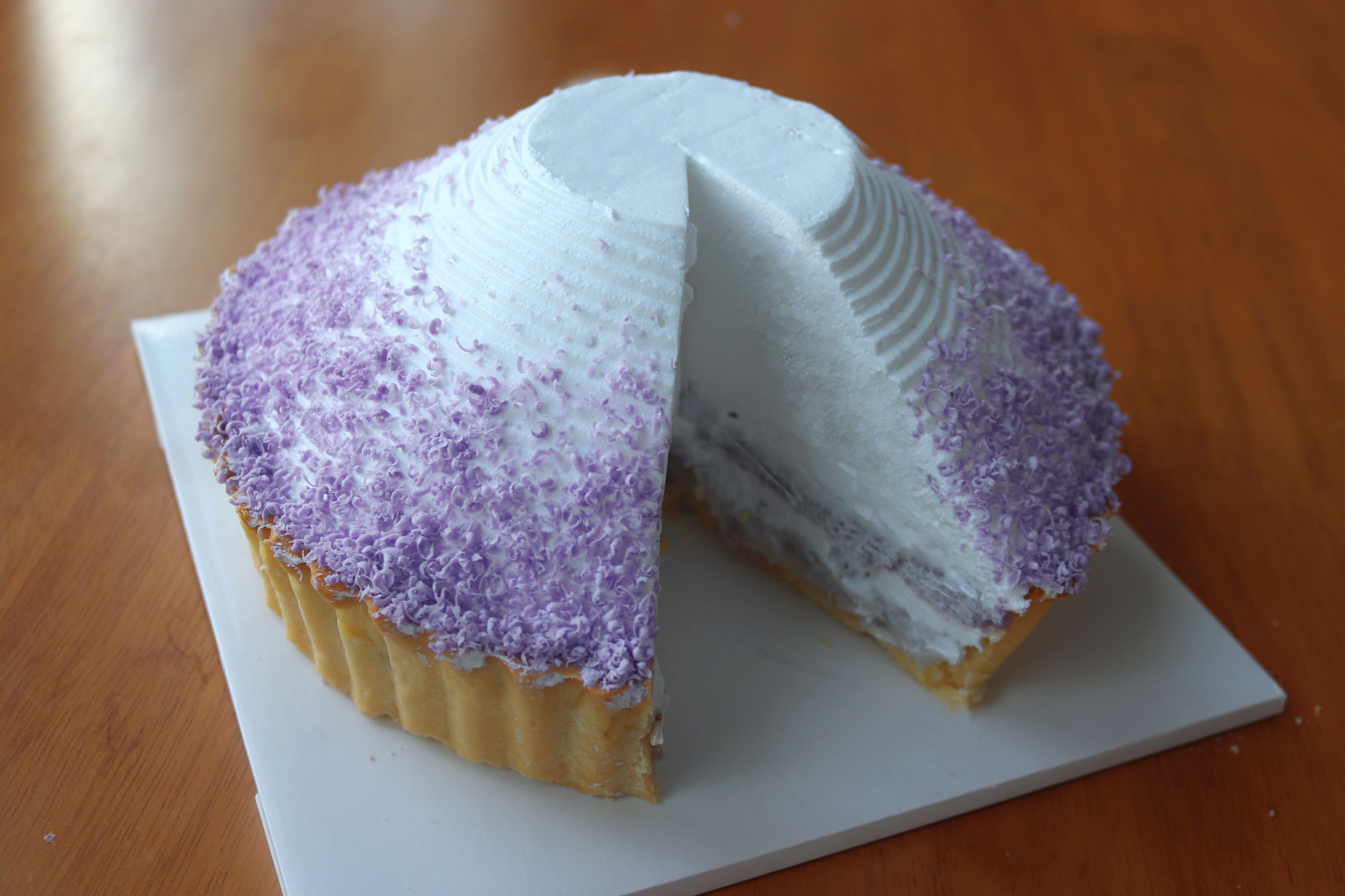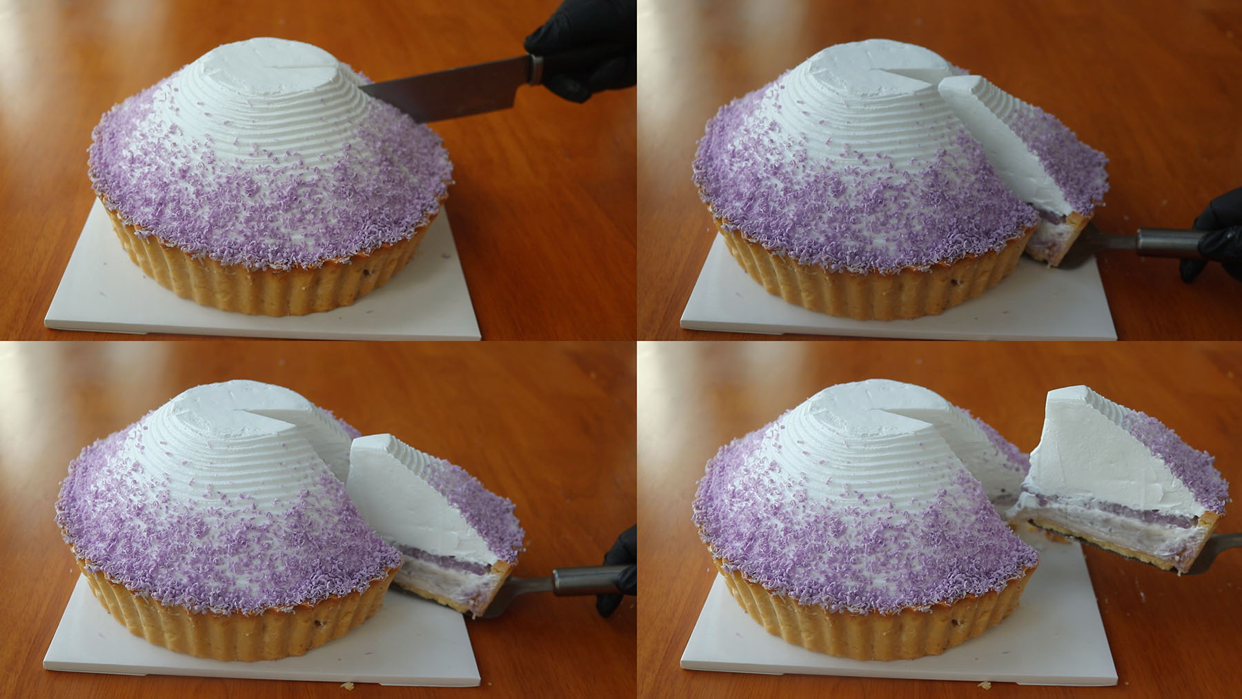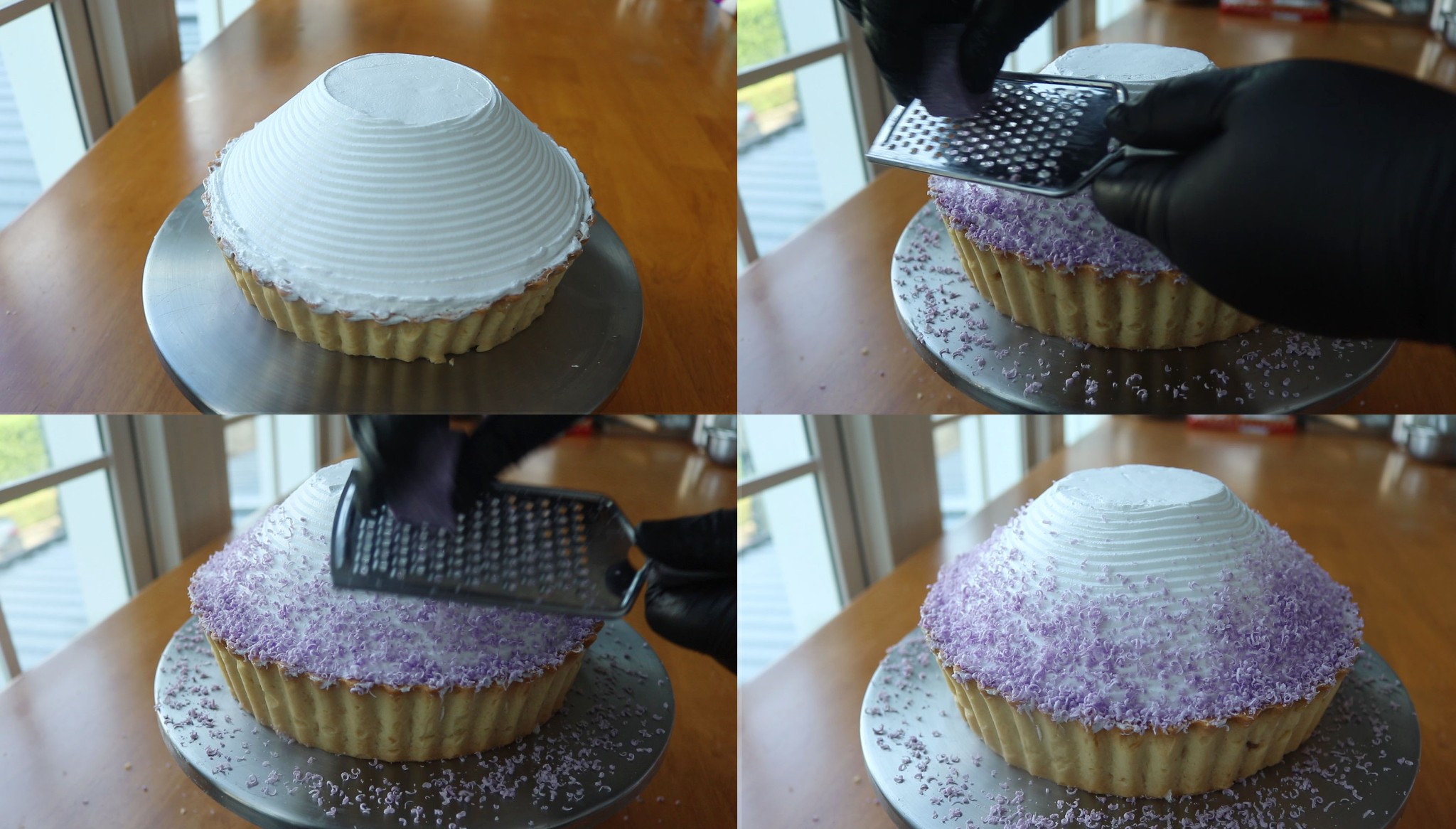 16.ท็อปปิ้งด้วยโคตติ้งสีม่วง นำไปแช่ตู้เย็นให้เซตตัว