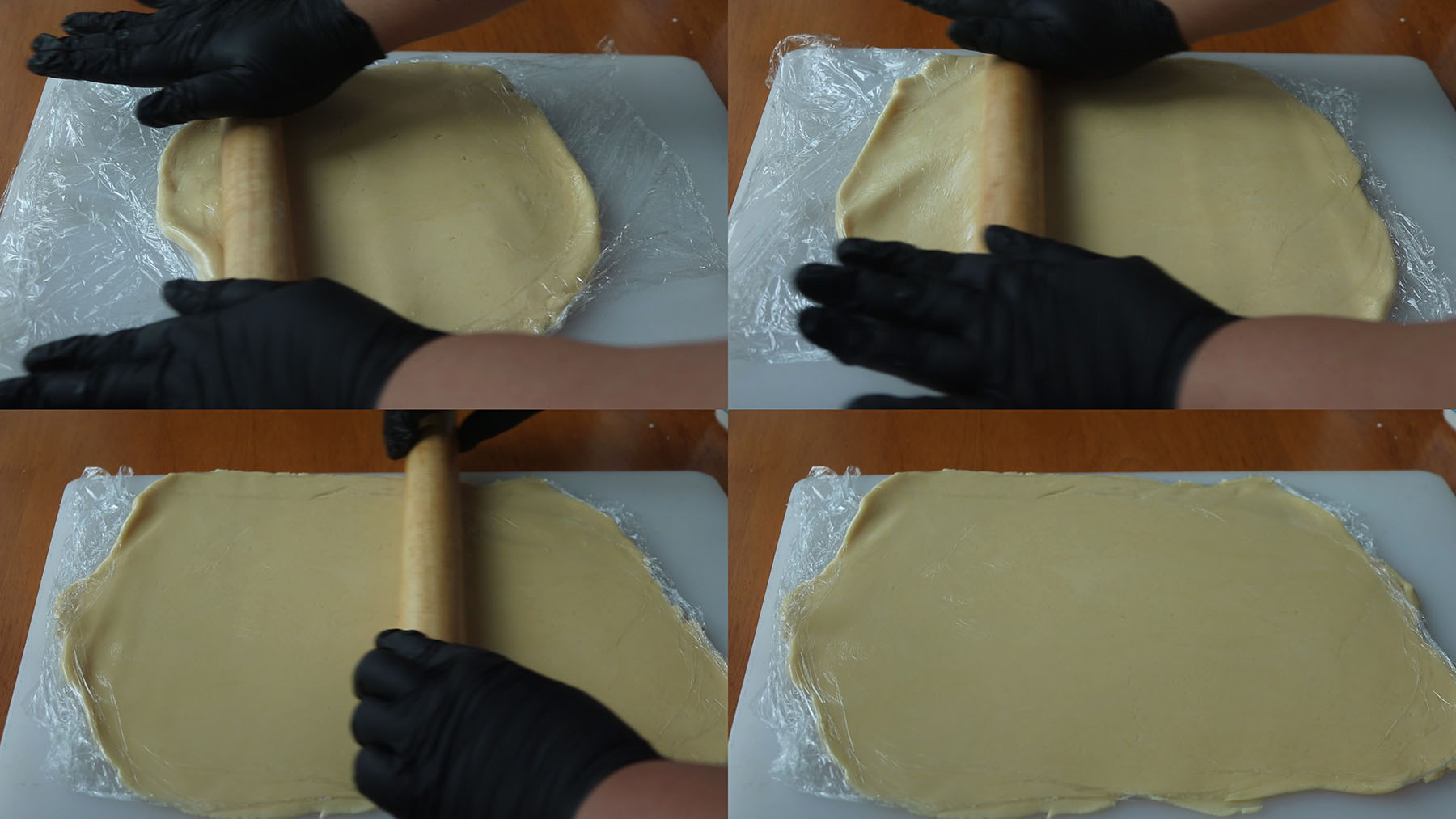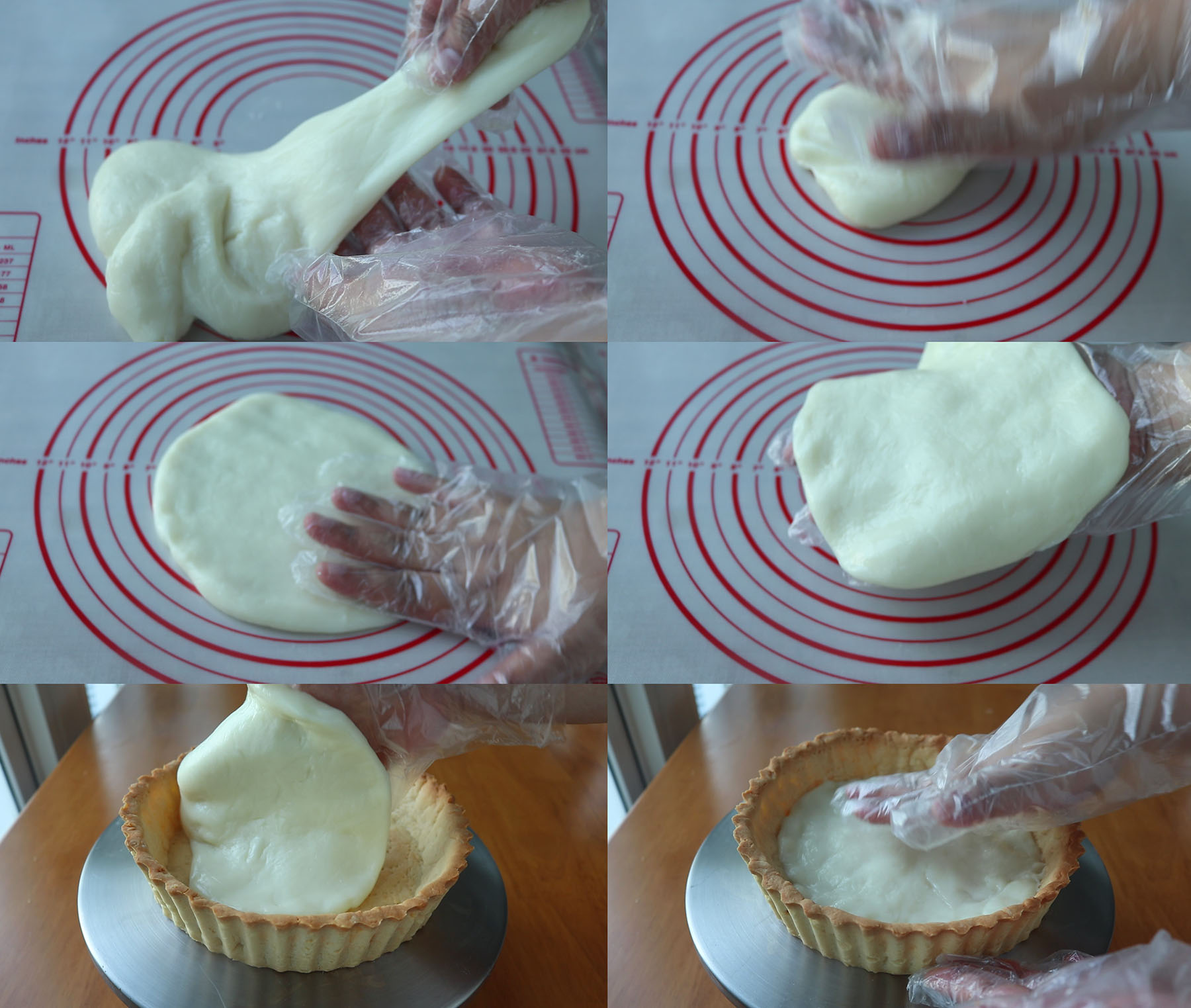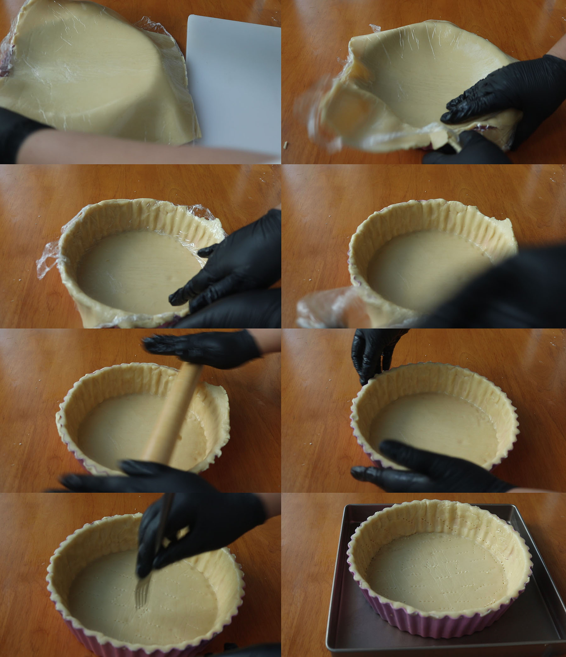 11.พอแป้งเย็นแล้วนำมาแผ่เป็นวงกลมและวางลงไปในทาร์ต