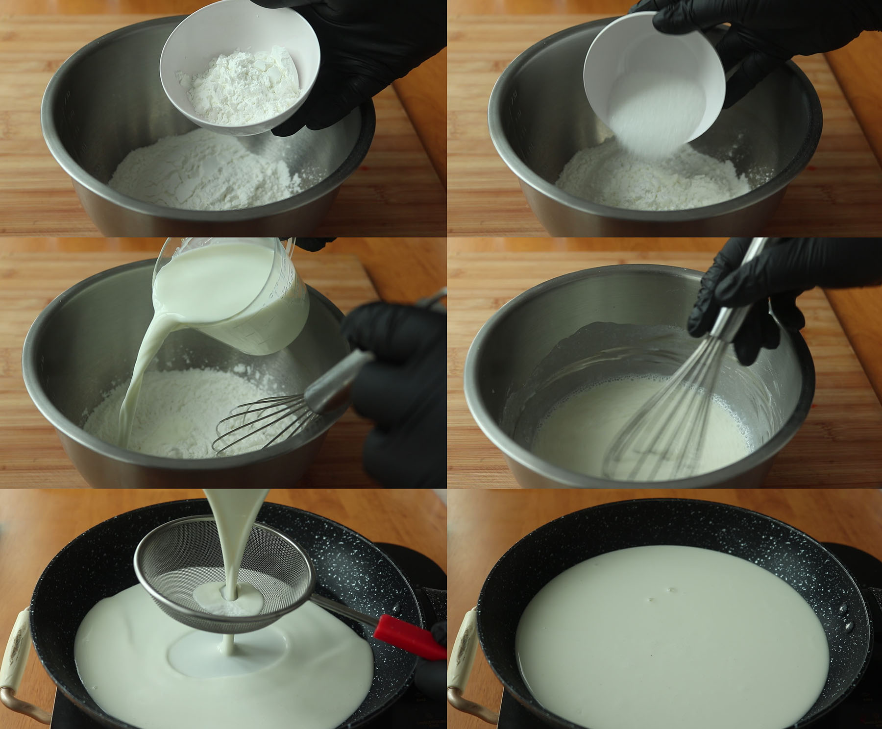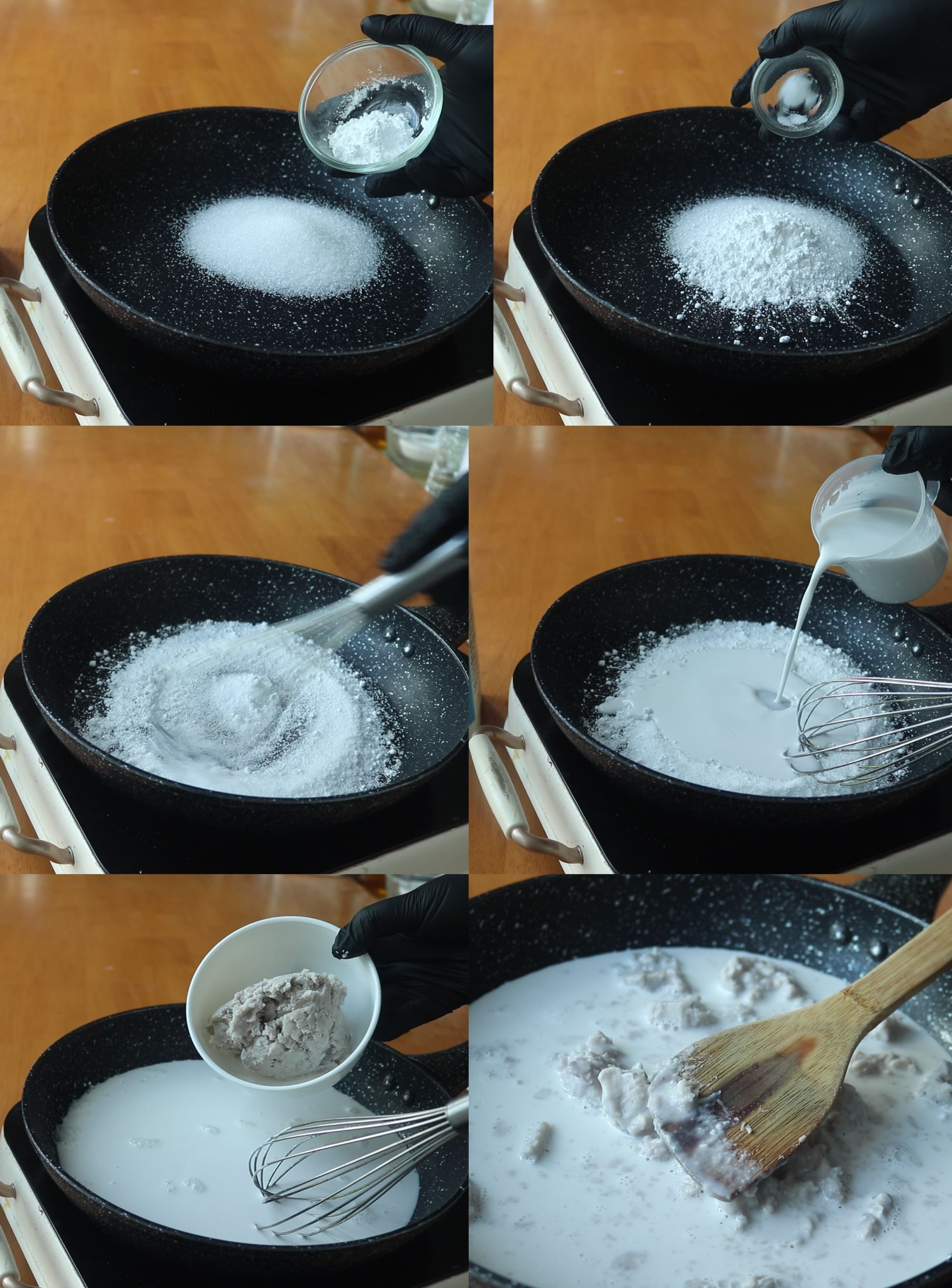 9.ทำแป้งโมจิค่ะ ใส่แป้งข้าวเหนียว แป้งข้าวโพด น้ำตาลทราย นมสดลงไปในชามผสม คนให้เข้ากัน นำไปกรอง