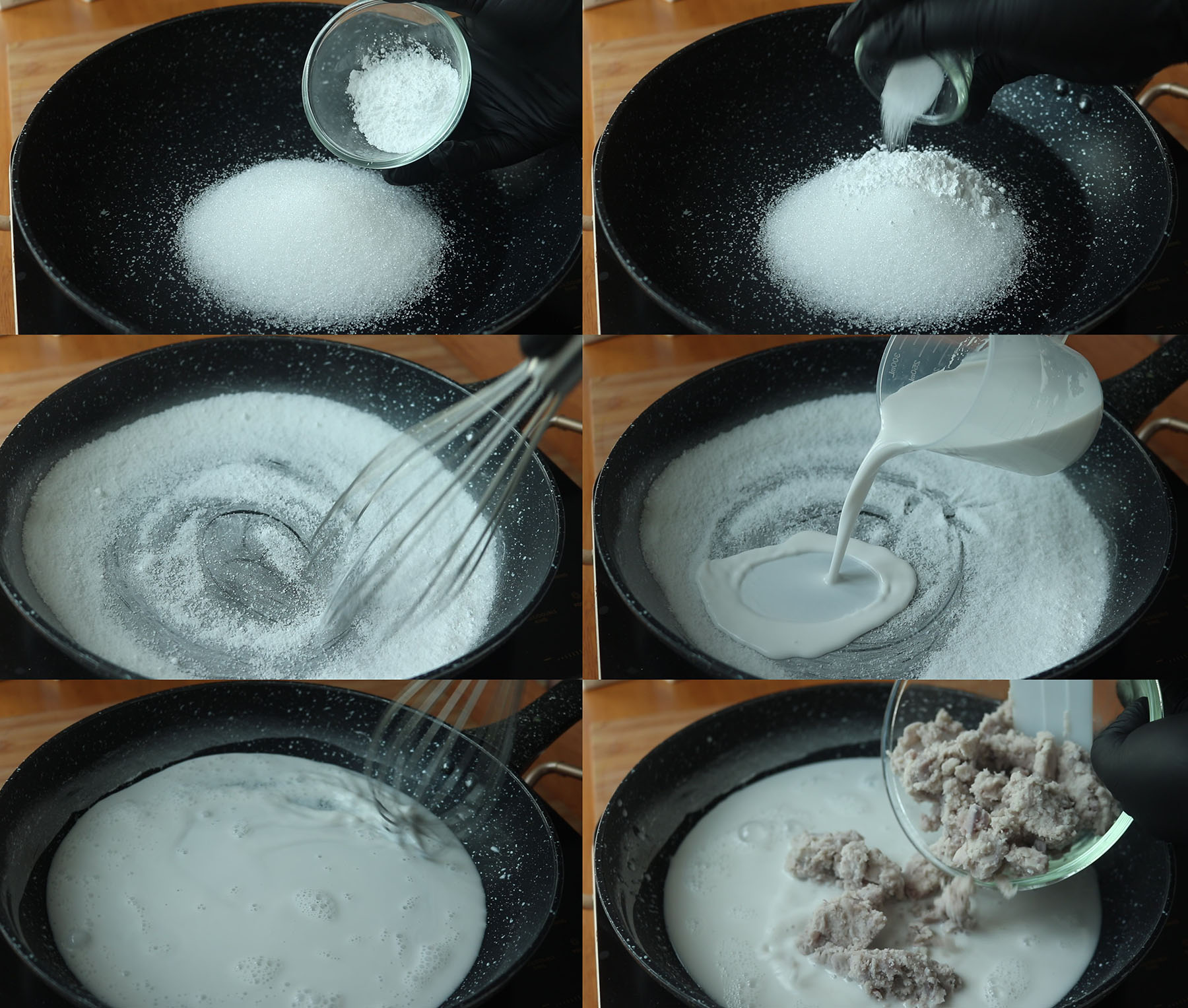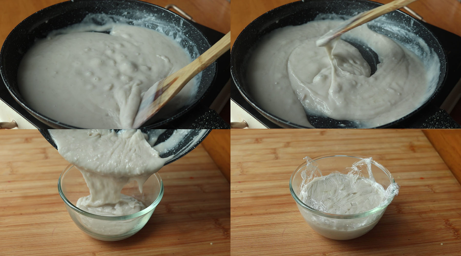 6.กวนด้วยไฟกลางไปทางอ่อนจนเดือด พอเดือดแล้วดับเตา พักไว้ในชามจนเย็นสนิท