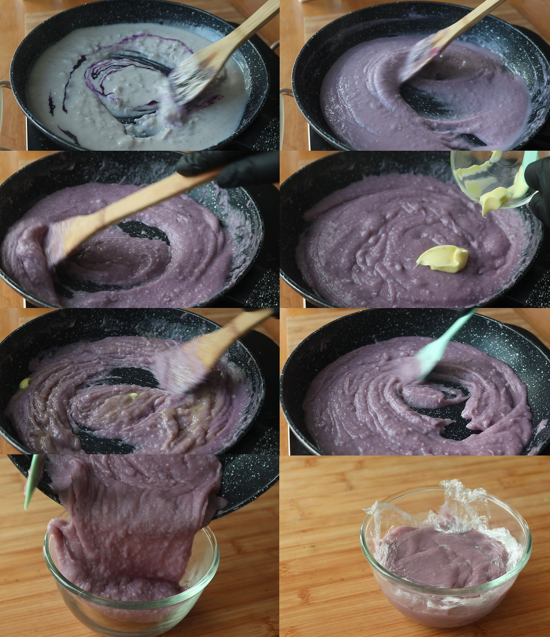 8.กวนด้วยไฟกลางไปทางอ่อน ใส่สีผสมอาหารสีม่วงลงไป กวนจนเข้ากันตามภาพ จากนั้นปิดเตาใส่เนยสดลงไป พักไว้ในชามจนเย็นสนิท