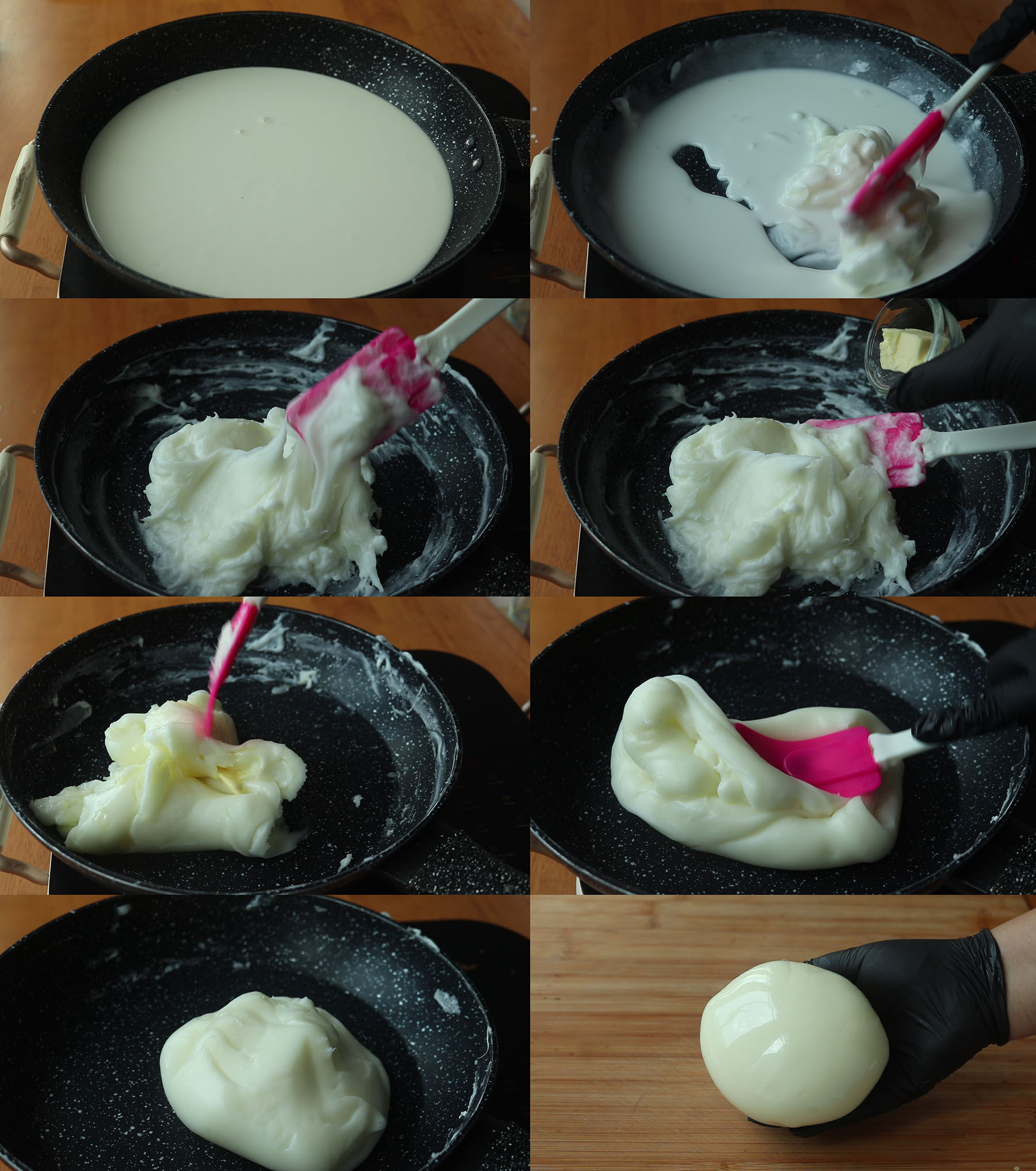 10.กวนด้วยไฟกลางไปทางอ่อนจนจับตัวกันเป็นก้อน จากนั้นดับเตาใส่เนยสดลงไป ผัดหรือกวนจนเข้ากันพักไว้จนเย็น เก็บไม่ให้โดนลมค่ะ