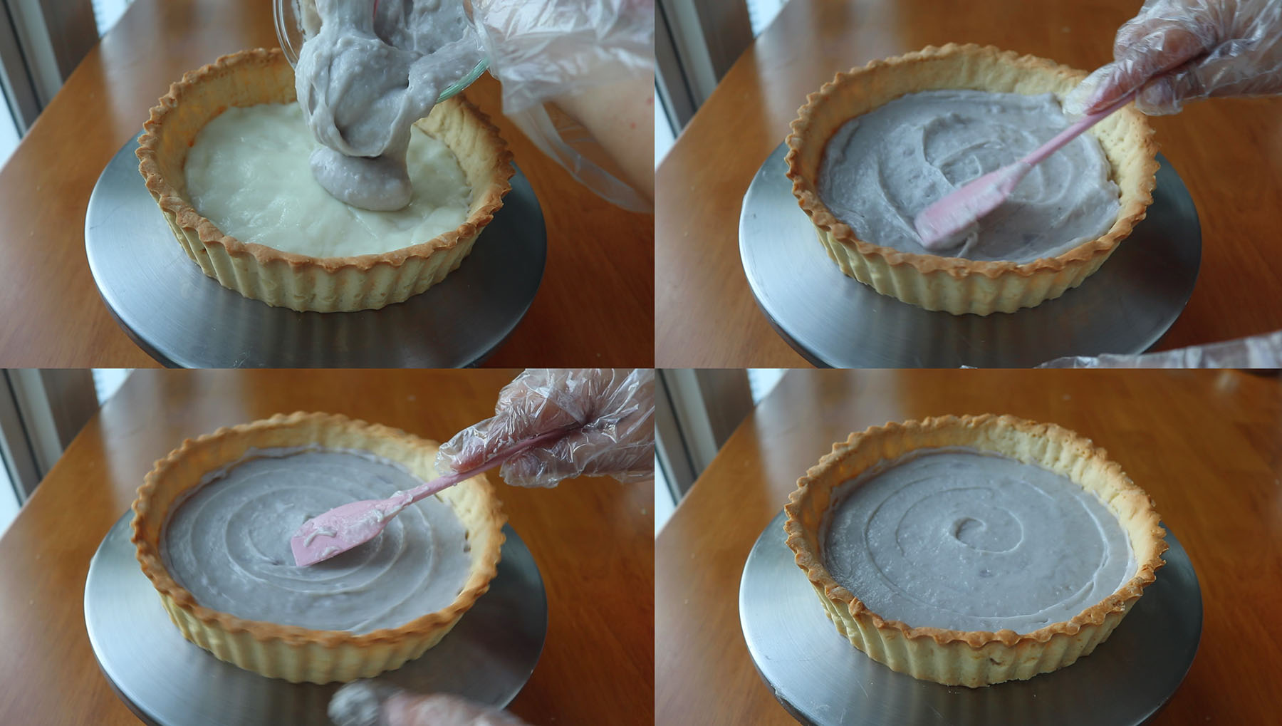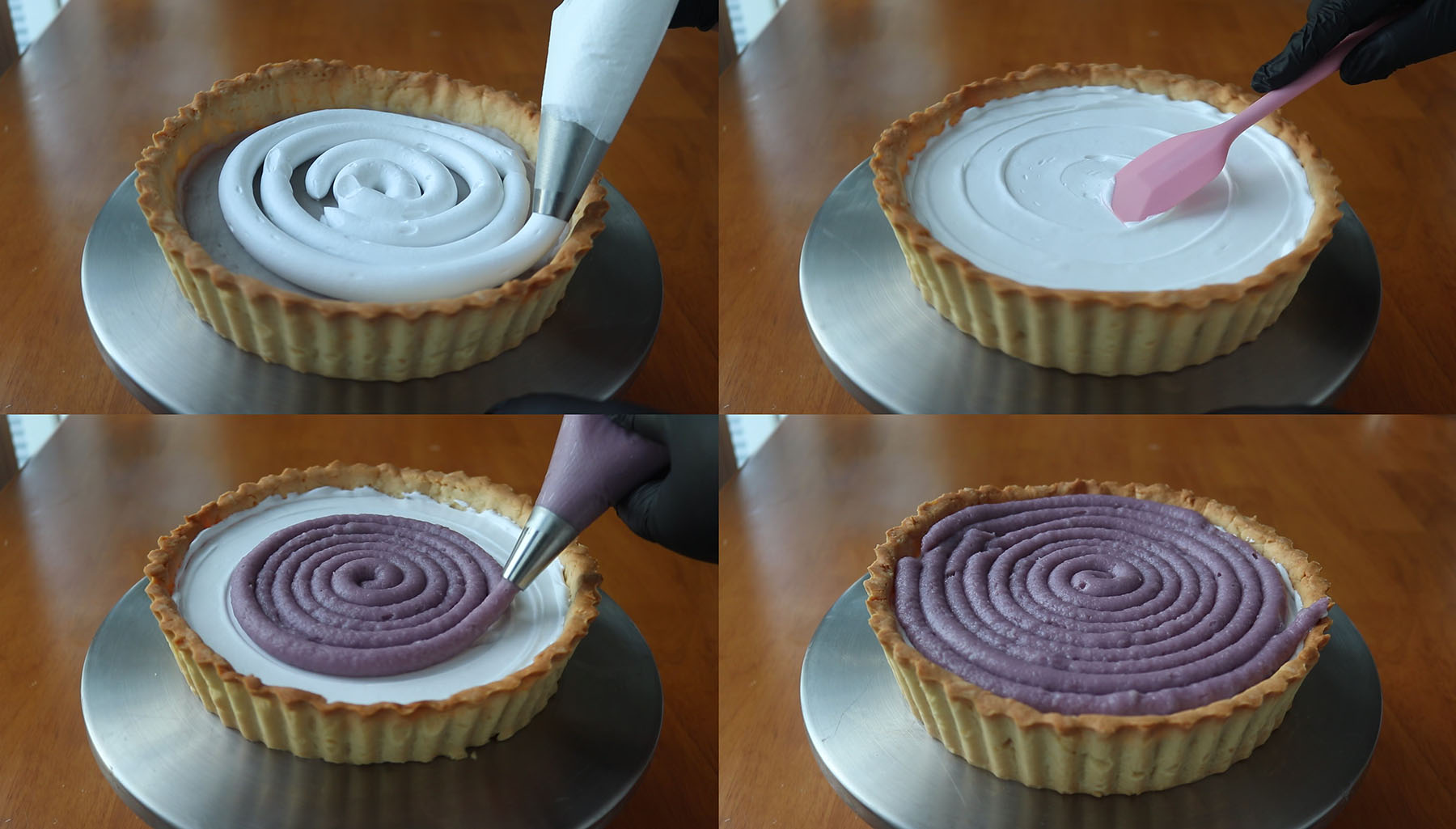 14.บีบวิปครีมลงไปในทาร์ต ตามด้วยเผือกกวน