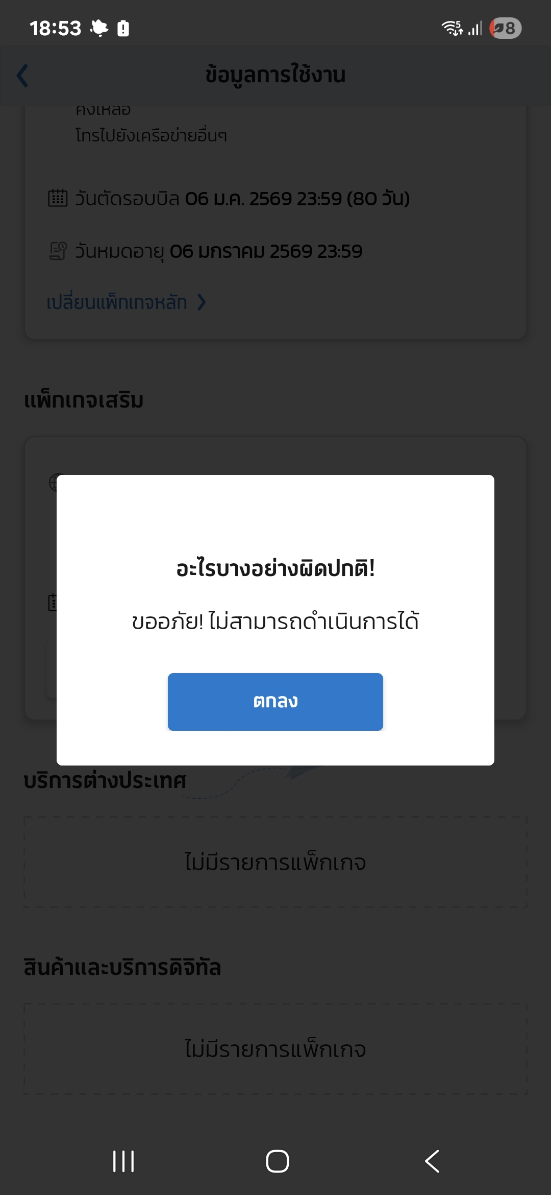 ยกเลิกแพ็กเกจเสริม dtac ผ่านแอพไม่ได้ โทร 1678 ก็ไม่ได้ (แจ้งว่าวงเงินเกินต้องขยายวงเงินเพิ่ม)