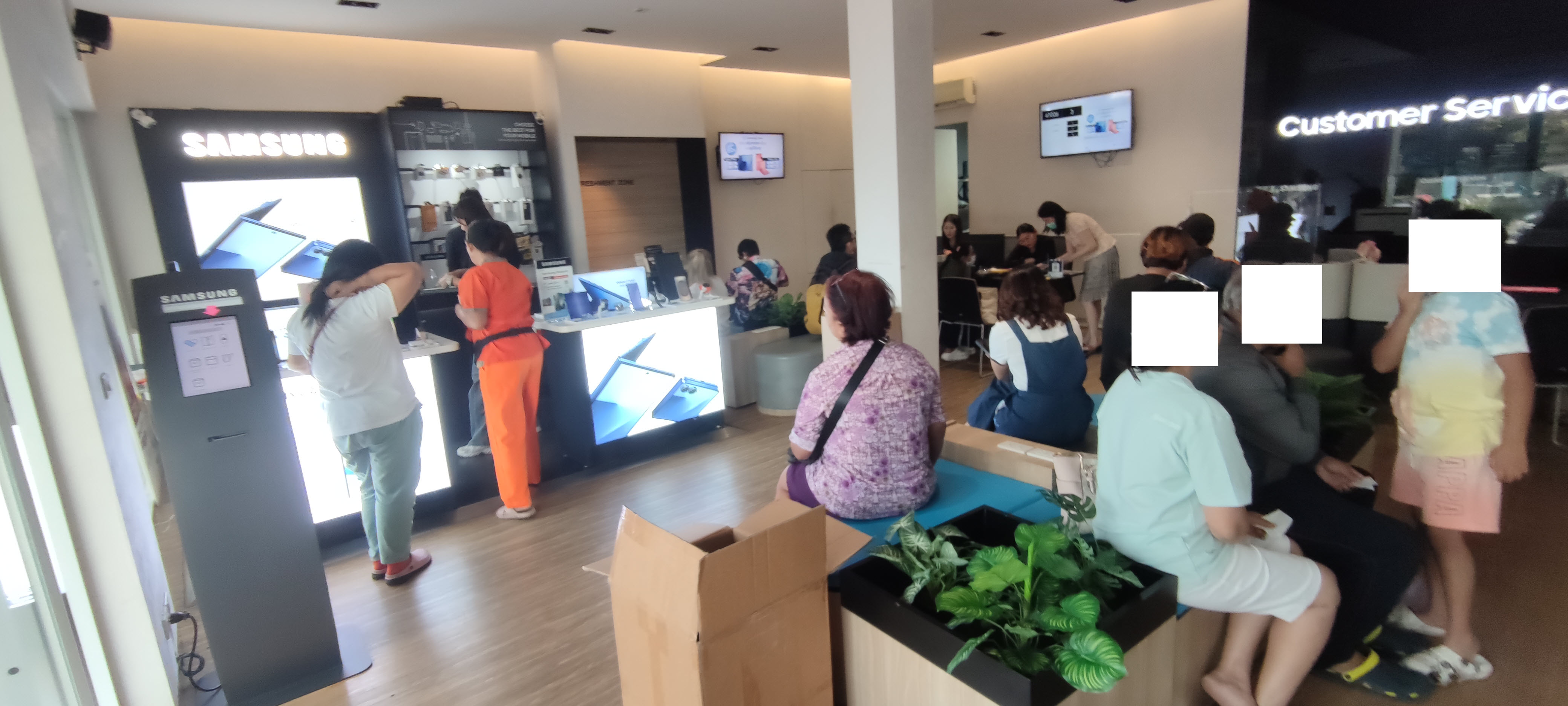 6. อีก 2 วัน เข้าไปที่ศูนย์บริการซัมซุง เอาโทรศัพท์ไปเปลี่ยนแบตเตอรี่ ไปก่อนเที่ยง จะเปลี่ยนแบตเสร็จตอนเย็น ไปถึง คนเพียบ ไม่มีที่นั่ง ต้องยืน คนยืนกันหลายคน กดบัตรคิว รอเรียก รอนานมาก