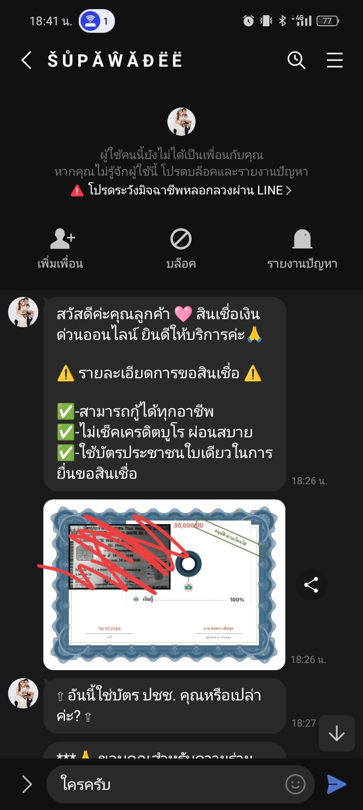 คือผมเดือดร้อนต้องการใช้เงินด่วน พอผมเปิดเฟสบุคก็เจอเพจๆนึง #อนุมัติทันที รับยอดชัวร์เงินทองคุณเอก# เป็นการกู้เงินนอกระบบ ผมจึงสอบถามไปว่าต้องทำยังไง เค้าก็บอกให้ส่งเอกสารแบบถ่ายรูปไป. โอเคผมก็ถ่ายรูป