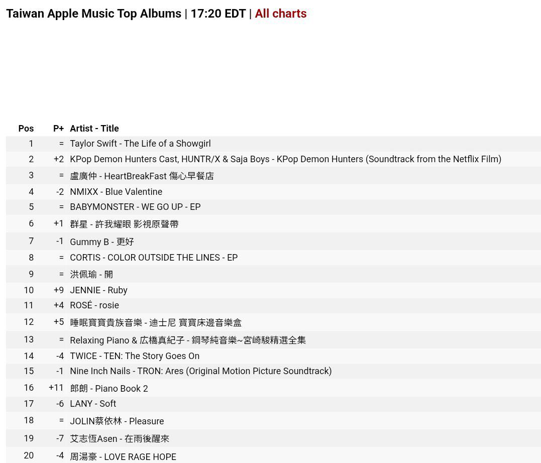 “Ruby” ของ เจนนี่ กลับเข้าชาร์ต Top 10 ของ Taiwan Apple Music Album Chart ที่ #10 (+9) หลังจากเจนนี่ขึ้นแสดงในคอนเสิร์ต Blackpink Deadline World Tour in Kaohsiung