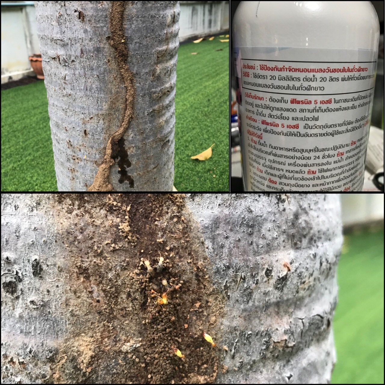 ปลวกขึ้นต้นไม้ครับ เลยหาซื้อฟิโฟรนิล ใช้ฟิโฟรนิลประมาณ 0.3 ml+ น้ำเปล่า 300 ml ผมใช้วิธีเขี่ยเปิดทางเดินปลวก ประมาณ 3 จุด พอเห็นตัวปลวกก็ฉีดใส่ เดาได้ว่าน่าจะโดนตัวปลวกประมาณ 20-30 ตัวได้ และราดตามโคนต้นด้วย ตอนนี้ผ่านไป 4 ชม ปลวกปิดทางเดินใหม่ไปแล้ว