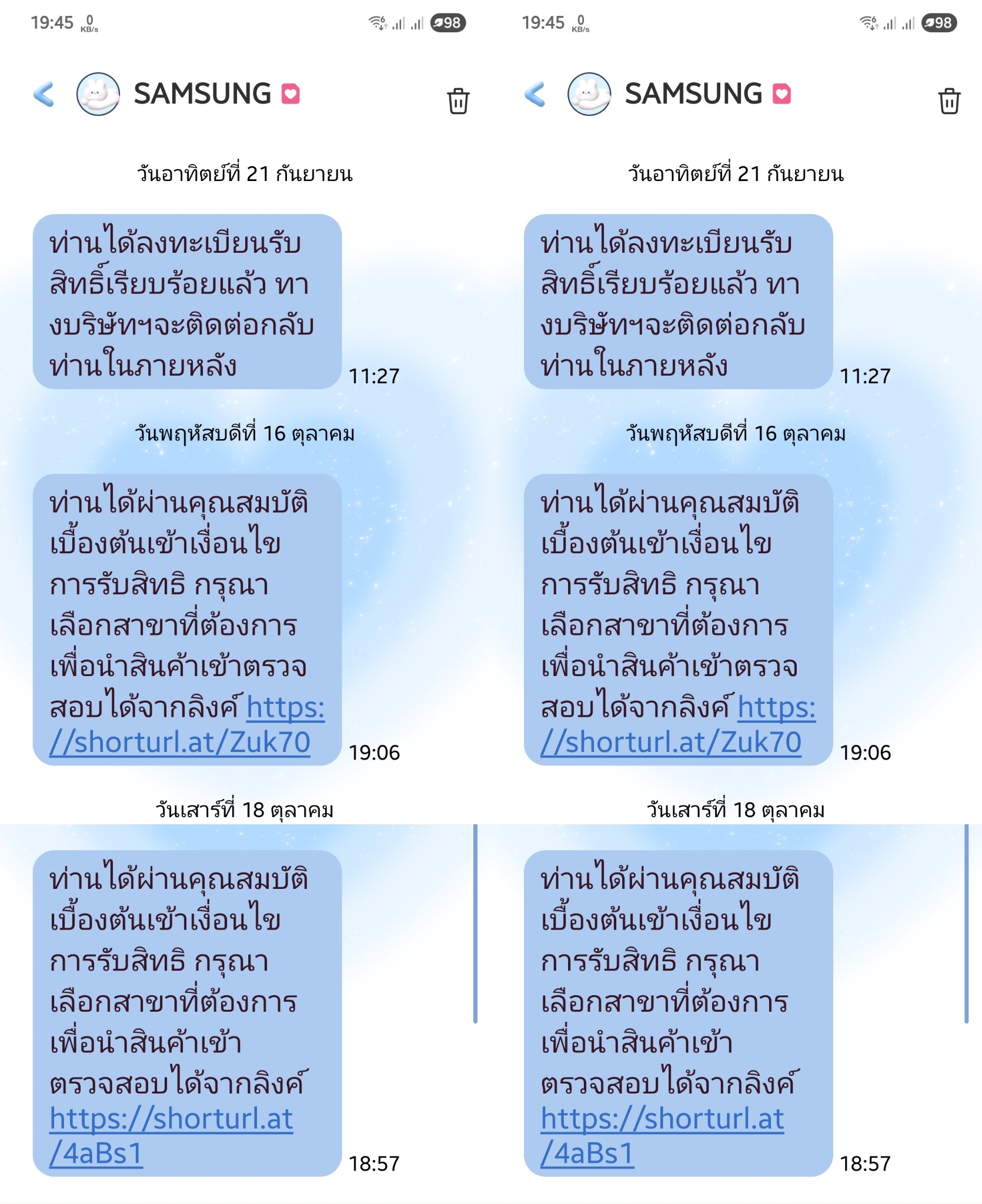 - ทาง ซัมซุง ได้ส่งข้อความนัดหมาย ไปรับเงินคืน มา 2รอบ