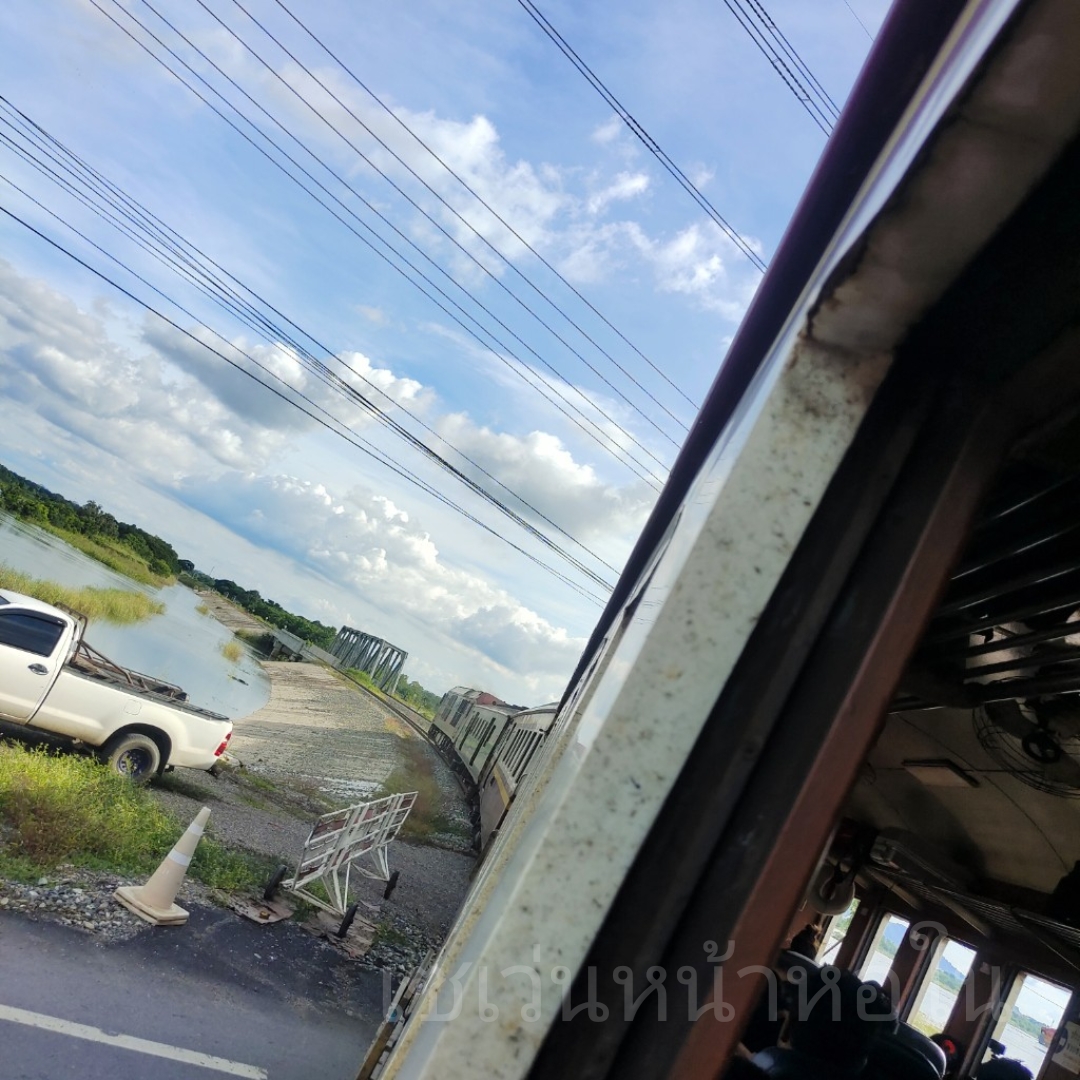 ถ่ายตอนรถไฟกำลังข้ามสะพานเหล็ก กระแสน้ำหลากเข้าบึงบรเพ็ด