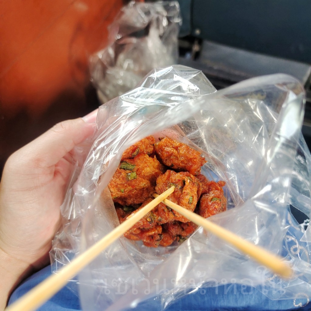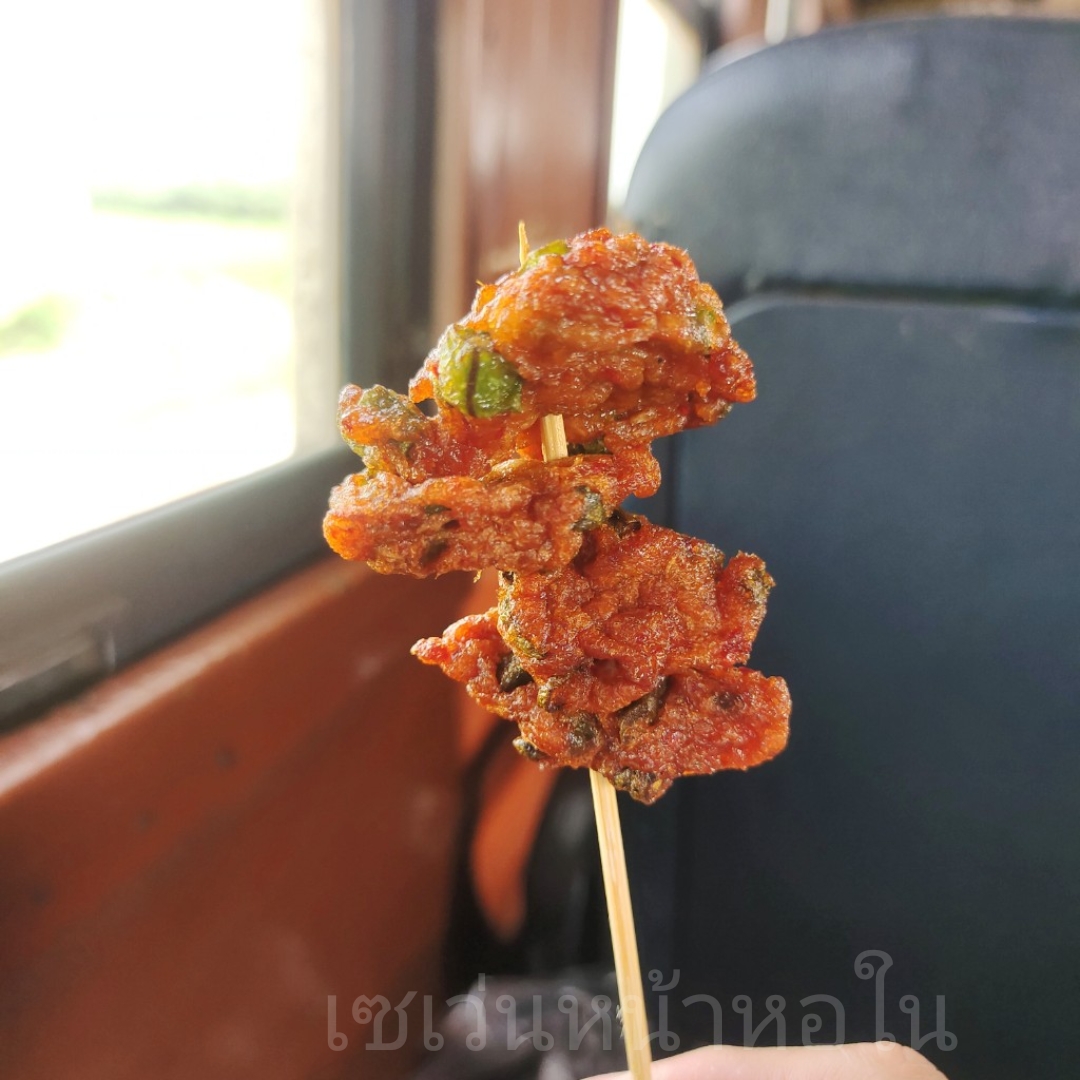 เห็นผู้โดยสารบริเวณนั้นสั่งทอดมันของแกหลายคนเลยครับ แกเห็นผมมองก็จิ้มมาให้ชิม2ชิ้น