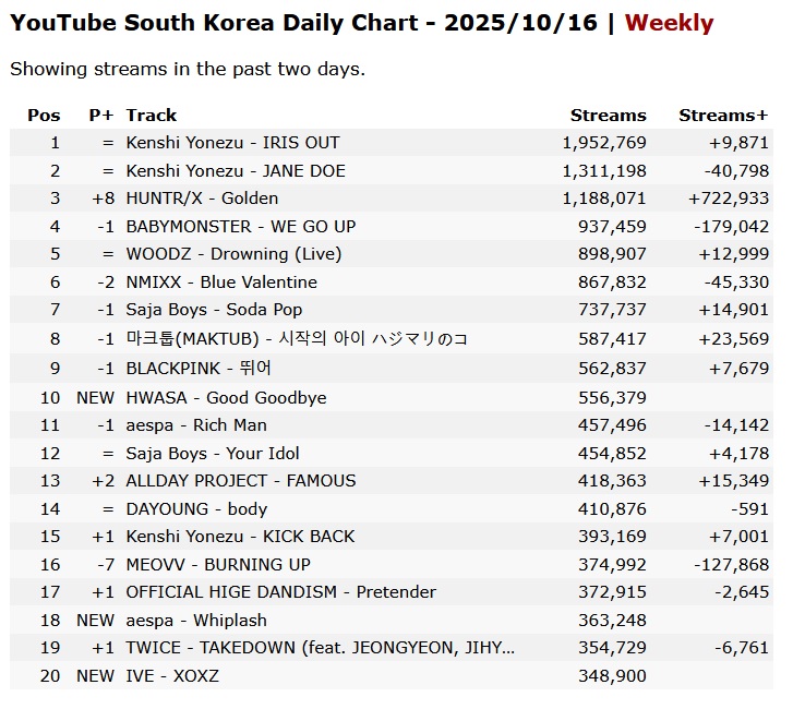 จะเห็นได้ว่า #1 ไม่ใช่เพลง K-pop แต่เป้น Kenshi Yonezu ศลป. J-Pop จากญี่ปุ่น และเมื่อดูข้อมุลล่าสุด ก็ยังคงเป็น Kenshi Yonezu ครองอันดับ 1