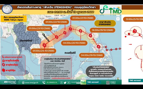 เช้าวันที่ 19 ตุลาคม 2568 มีรายงานว่า เฟซบุ๊ก กรมอุตุนิยมวิทยา อัปเดตเส้นทางพายุโซนร้อน “เฟิงเฉิน” (FENGCHEN)