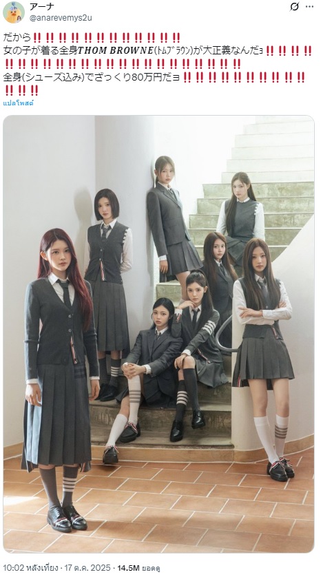 โพสของ Hearts2Hearts ในชุดเครื่องแต่งกายของแบรนด์ Thom Browne มียอดเข้าชมกว่า 14 ล้านใน X