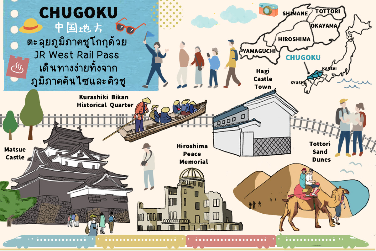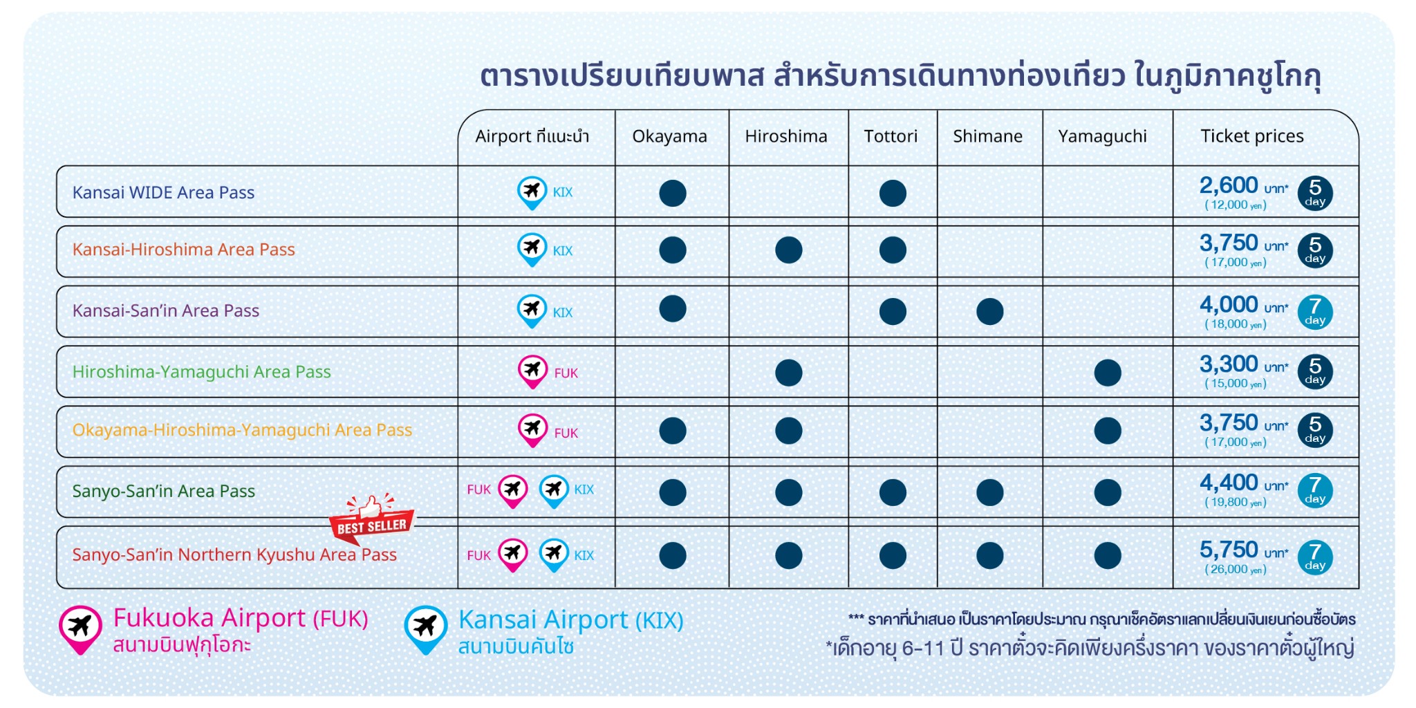 นอกจากนั้นเราขอแนะนำบัตรโดยสารของบริษัท JR-WEST หรือ West Japan Railway Company ที่สามารถใช้เดินทางท่องเที่ยวด้วยรถไฟในภูมิภาคชูโกกุแสนสะดวก และครอบคลุมทั้งผู้ที่เดินทางจากสนามบินฟุกุโอกะ และสนามบินนานาชาติคันไซได้อีกด้วย