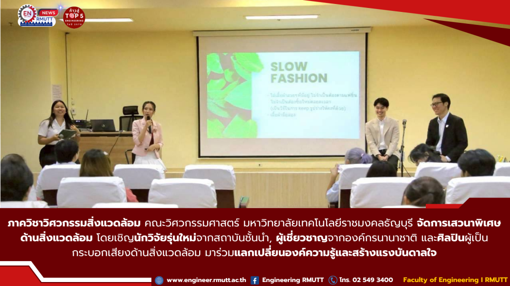 วันที่ 3 ตุลาคม 2568 ภาควิชาวิศวกรรมสิ่งแวดล้อม คณะวิศวกรรมศาสตร์ มหาวิทยาลัยเทคโนโลยีราชมงคลธัญบุรี (มทร.ธัญบุรี) จัดการเสวนาพิเศษด้านสิ่งแวดล้อม โดยเชิญนักวิจัยรุ่นใหม่จากสถาบันชั้นนำ, ผู้เชี่ยวชาญจากองค์กรนานาชาติ และศิลปินผู้เป็นกระบอกเสียงด้านสิ่งแวดล้อม มาร่วมแลกเปลี่ยนองค์ความรู้และสร้างแรงบันดาลใจ
