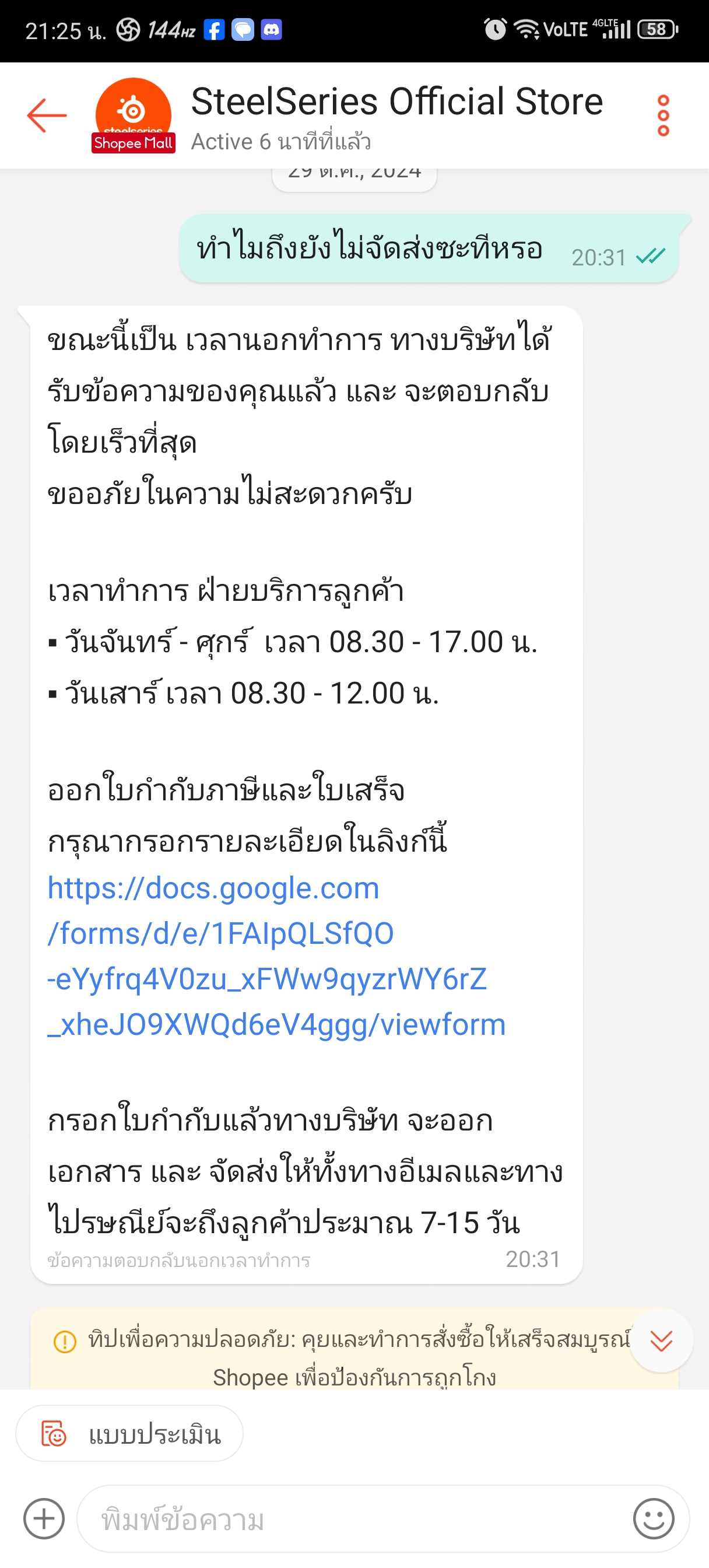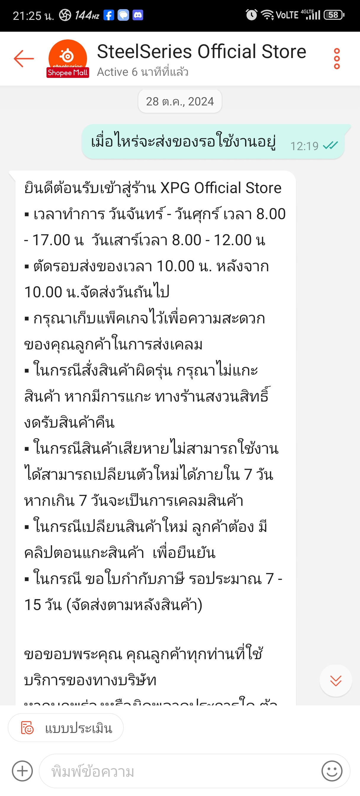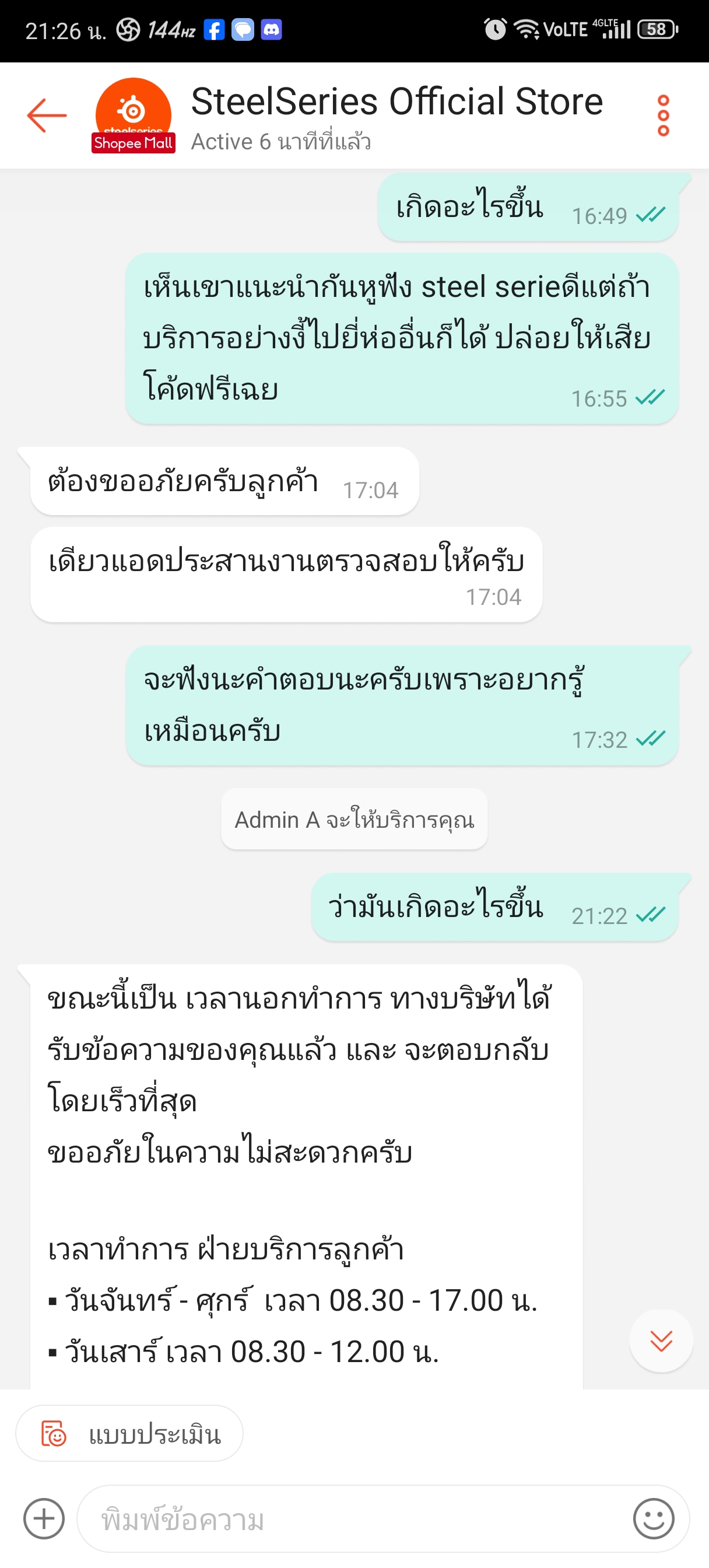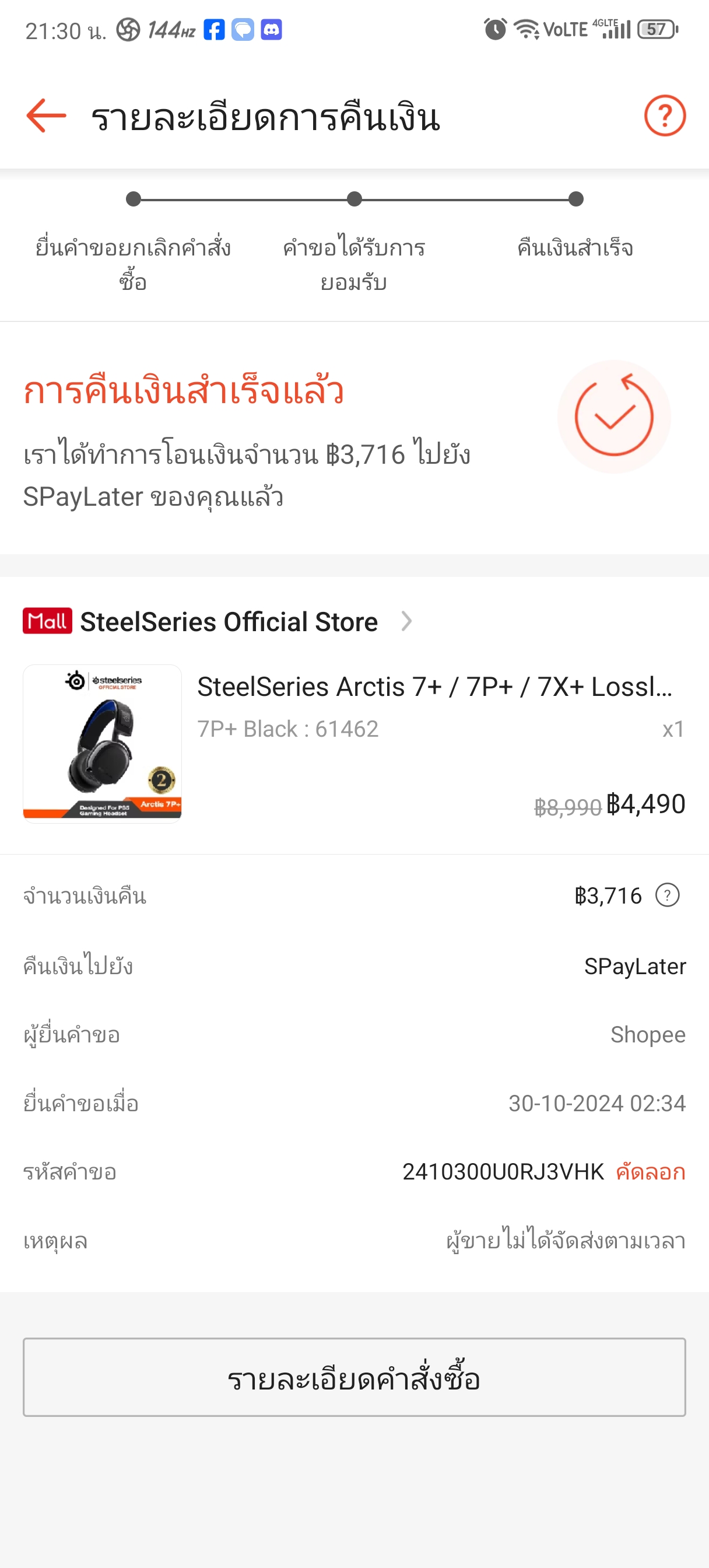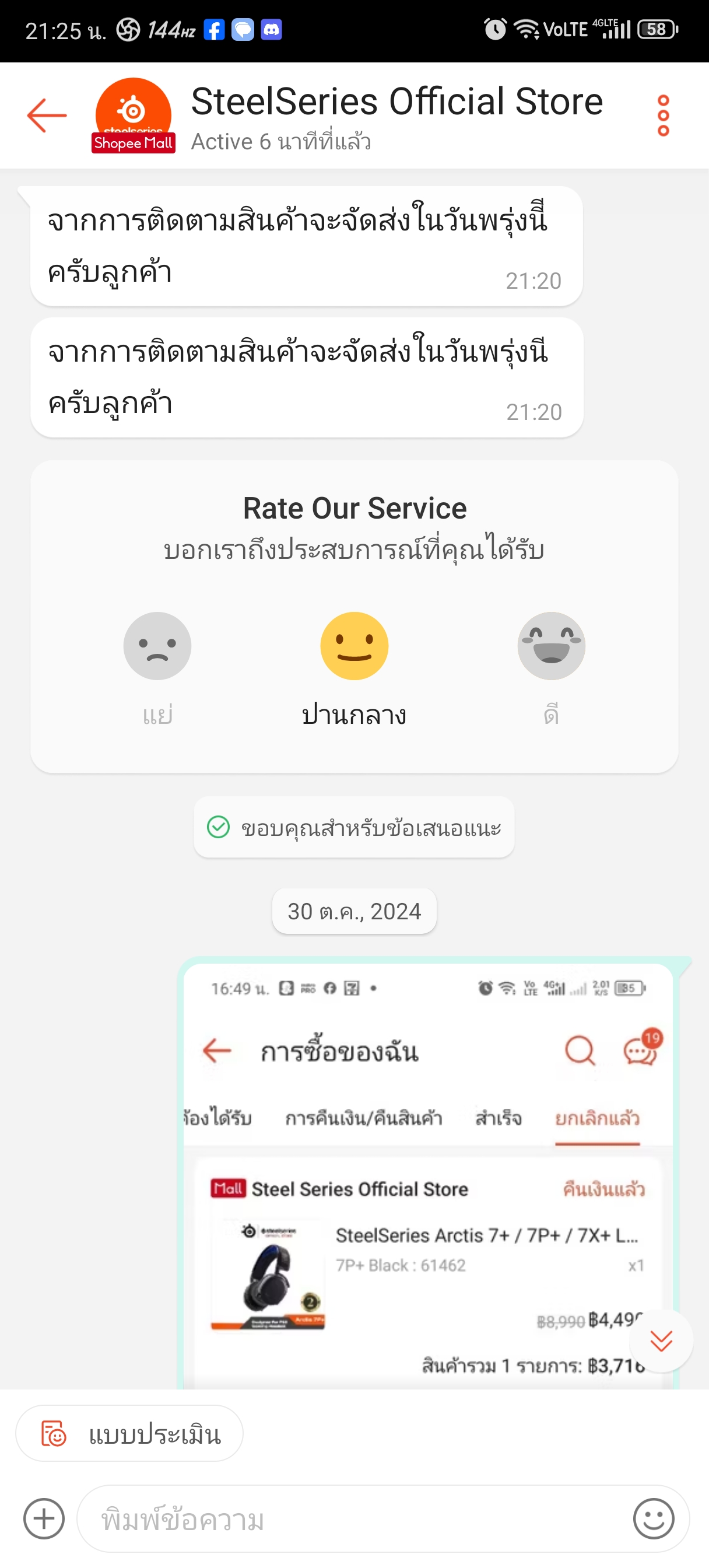 ตอนแรกว่าจะปล่อยมันผ่านไปเพราะเรื่องก็ผ่านไปสักพักแล้วแต่เกิดเปลี่ยนใจอยากแชร์ขึ้นมาเพราะมันก็ค่อนข้างคาใจพอสมควรแถมยังไม่ได้รับคพฝำอธิบายใดๆจากทางแบรนด้วย ตอนนั้นเนื่องด้วยหูฟังเก่าไปหวันพอดี เลยปรึกษาน้องชายที่ค่อนข้างเก่งitให้ช่วยแนะนำให้หน่อยน้องเลยอนะนำเป็นของsteelseries arctis 7+มาเพราะน้องชายก็ใช้แถมยังแนะนำคีบอร์ดด้วย ไอเราได้ยินชื่อเสียงแบรนมานาน+กับหารีวิวเพิ่มเห็นว่ารีวิวค่อนข้างดีเลยมีแต่คนชมและฟังชั่นที่ค่อนข้างครบเครื่องจึงทำให้ตัดสินใจไม่ยาก กดเข้าแอพshoppeeและหาร้านofficialโดยไว+ตอนนั้นมีโค้ดลดด้วย กดสั่งมาในราคา3716บาทในวันที่25/10/2024ซึ่งราคานี้ค่อนข้างถูกกว่าปกติ เอาเราก็เสียตังละสบายใจละที่เหลือก็รอขอมาส่ง แต่ผ่านไปแล้ว3วันจาก25ไปวันที่28ของก็ยังไม่ถูกจัดส่งซึ่งมันผิดปกติมากๆเพราะปกติจะจัดส่ง(แพ็คพัสดุส่งขนส่ง)ผ่านใน1-2วันอันนี้ไม่รวมเวลาขนส่ง ก็เลยทักแชทไปทวงถามทางร้านแอดมินตอบมาว่าจะประสานงานตามให้แล้วเงียบไป มาถึงวันที่29 คอยเช็คทั้งวันว่าจะขึ้นจัดส่งให้ขนส่งแล้วเมื่อไหร่แต่จนมืดค่ำแล้วสถานะการจัดส่งก็ยังไม่เปลี่ยนแปลงเลยทักไปทวงถามอีกครั้งแอดทินตอบมาว่าสินค้าจะจัดส่งในวันพรุ่งนี้โอเคไอเราได้คำตอบมาแบบนี้ก็สบายใจว มาวันที่30วันที่แอดมินของทางร้านบอกว่าจะจัดส่งช่วงสายๆไอเราก็เช็คสถานะสินค้าตามปกติละแต่ปรากฎว่าสถานะสินค้ากลายเป็นถูกยกเลิกโดยร้านค้า ที่นี้ก็ร้อนละ4วันไม่จัดส่งวันที่5ดันยกเลิกก็เลยติดต่อไปทางร้านอีกครั้งเพราะต้องการคำตอบว่ามันเกิดอะไรขึ้นทำไมไม่จัดสินค้าแล้วที่บอกว่าจัดส่งในวันต่อมาแต่กลายเป็นยกเลิกมันคืออะไร ทางแอดมินตอบมาว่าจะตรวจแล้วก็เงียบหายไป จนมาวันที่31ก็แล้วก็ยังคงไม่ตอบกลับใดๆหลังจากก็คือไม่รอฟังคำตอบละครับโกรธมากๆ จนถึงวันนี้ก็ยังไม่มีการชี้แจงใดๆจากทางร้านเกี่ยวกับการสั่งซื้อนี้เลย ส่วนตัวซื้อของจากร้านofficialในshopeeบ่อยมากและไม่เคยเจอประสบการณ์ที่ไม่เป็นมืออาชีพแบบนี้จากร้านofficialแบรนใหนเลย