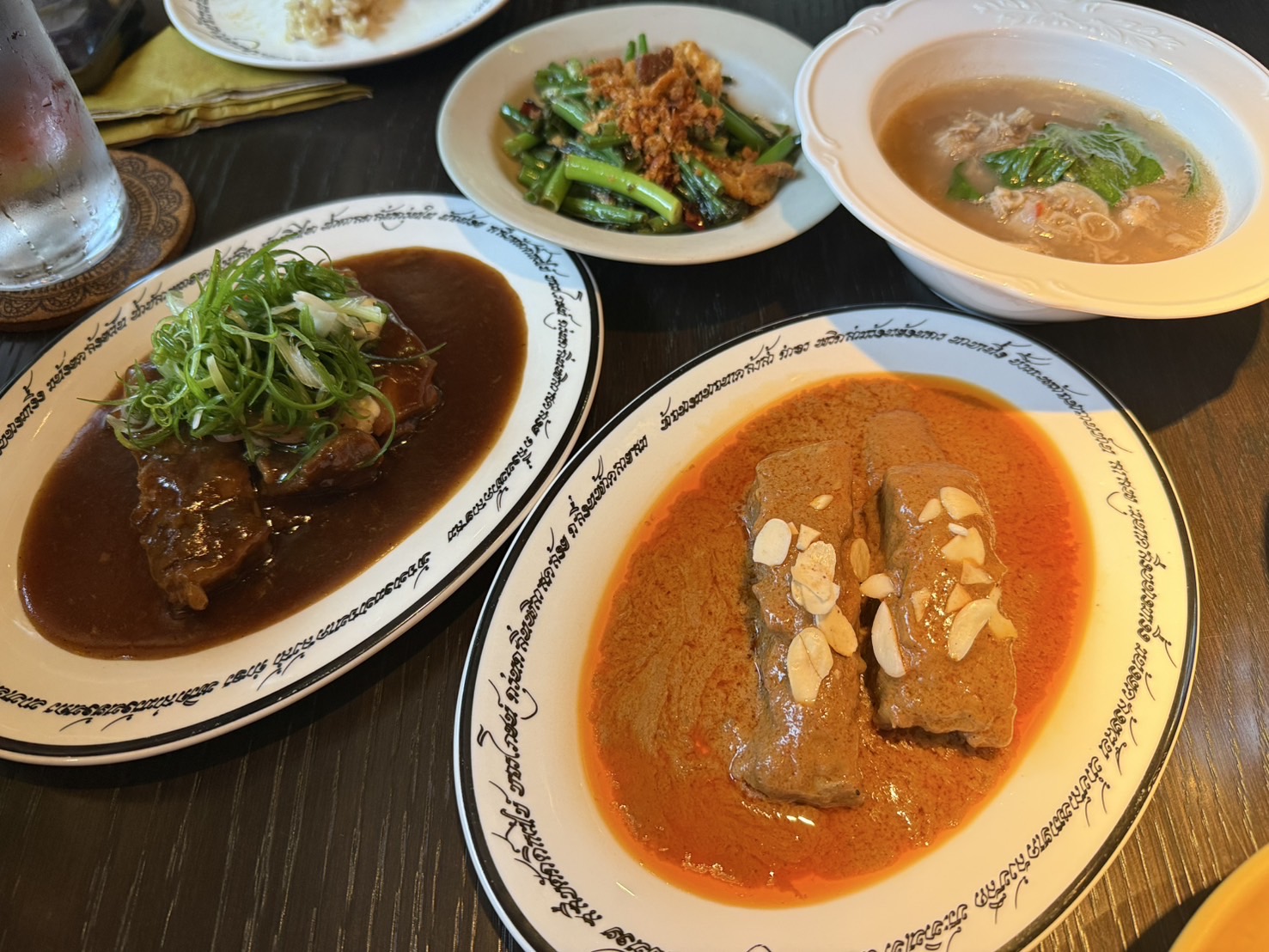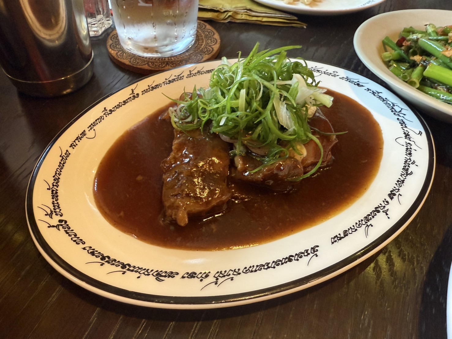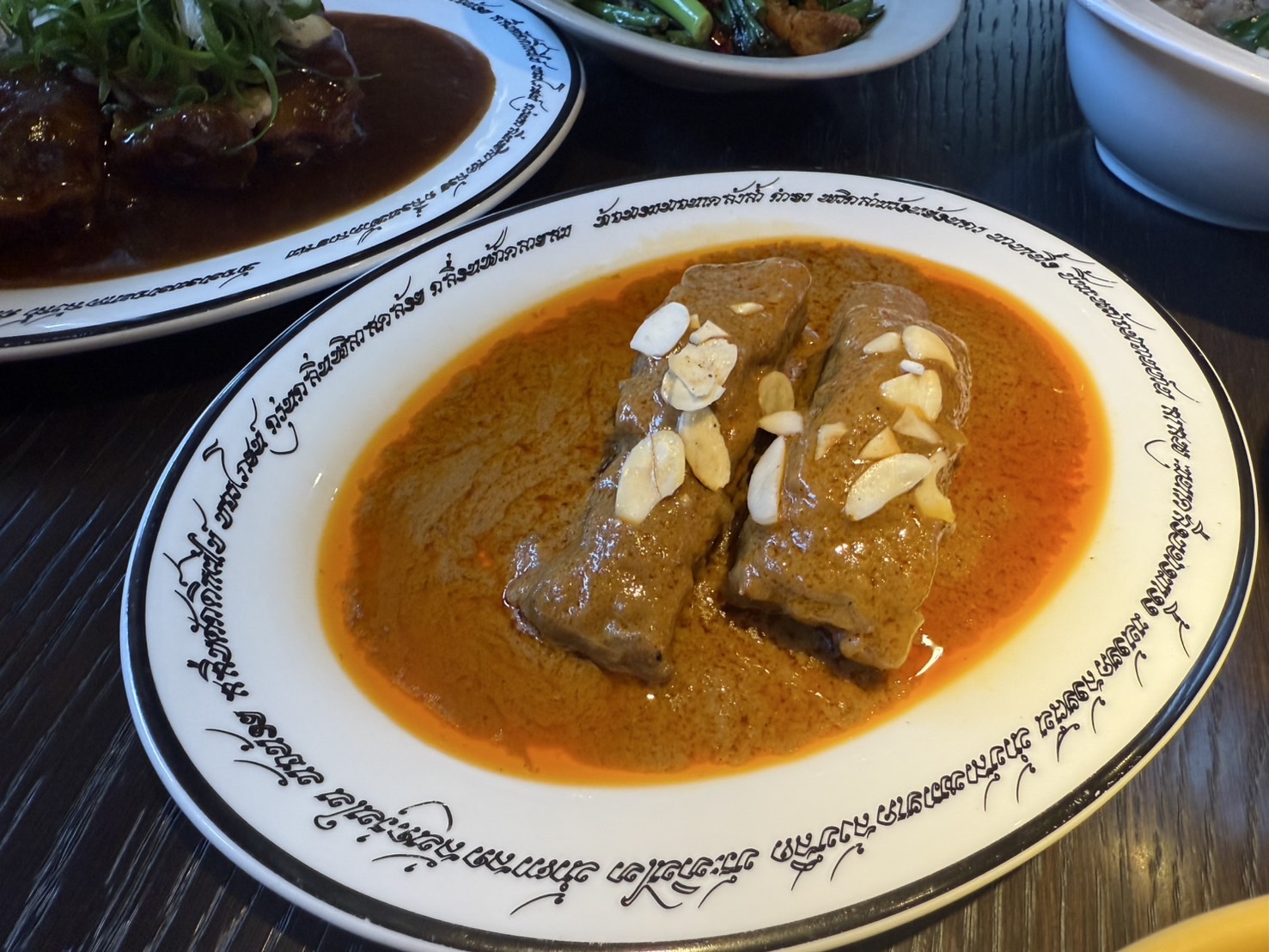 ในสำรับ มีมัสมั่นซี่โครงแกะมีเม็ดกระบกสไลด์โรยมา ตอนแรกคิดว่า เป็นอัลม่อน จานนี้เนื้อนุ่มอร่อย