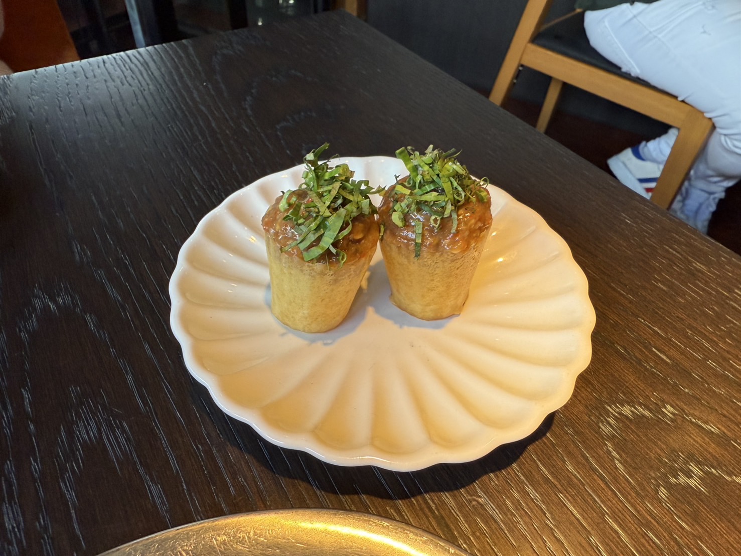 Apitizer สั่งยำมะเขือ เค้าเสริฟมาคล้ายเป็นกระทงทอง(คล้ายจะเป็นแตงกวา ทำเป็นถ้วย ขนาดพอดีคำ)
