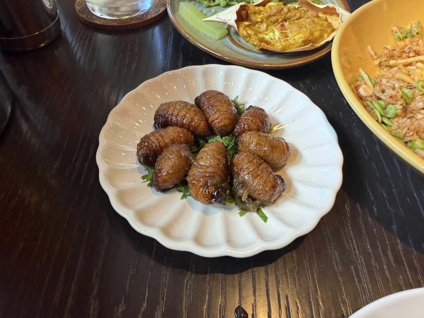ด้วงสาคู130++ ตัวนี้เค้าว่าเป็นด้วงมะพร้าวตัวโตมาก ขนาดตัวอวบอ้วนประมาณนิ้วก้อย กรอบ อร่อยมันๆ แต่ซอร์สเคลือบหวานไปนิด กินง่ายนะ มันไม่แหยงหยึย นะ