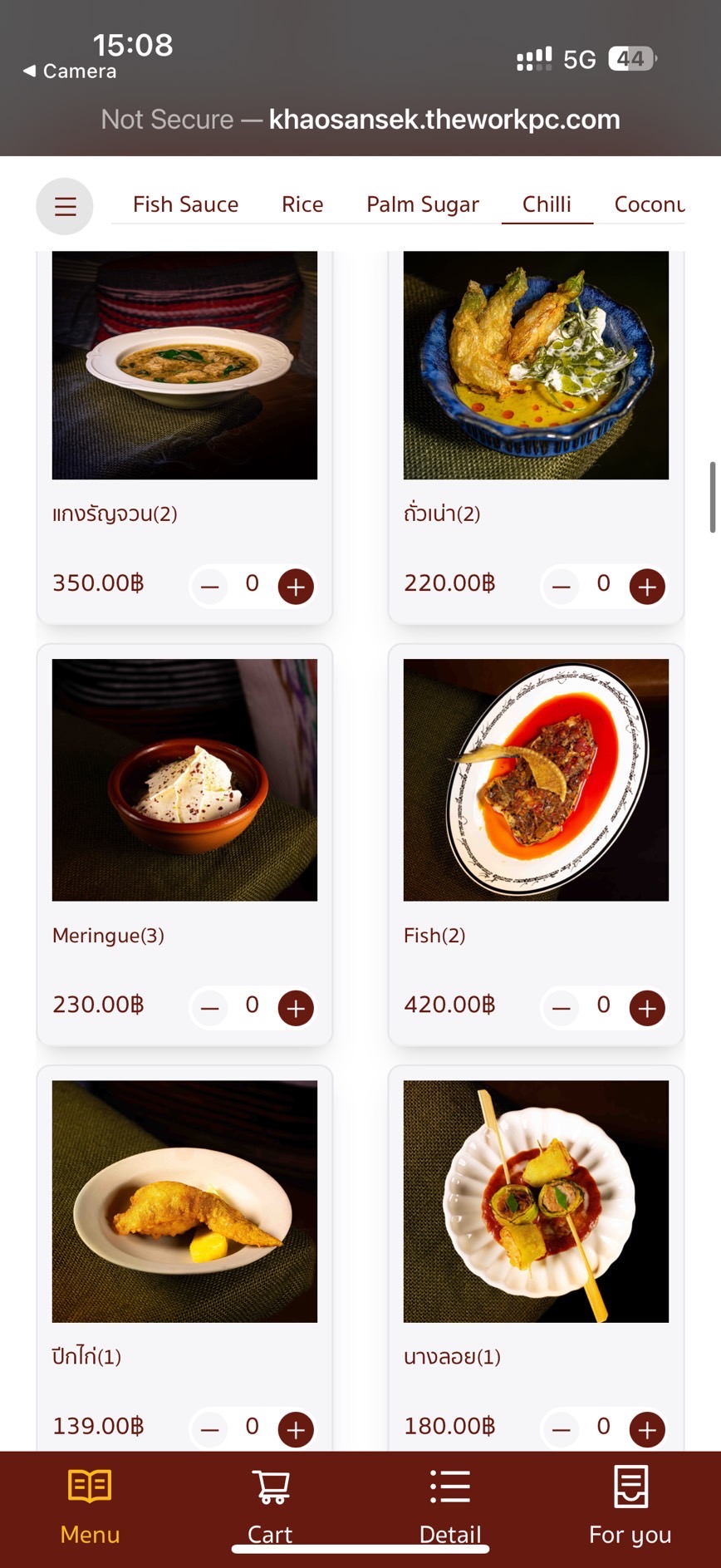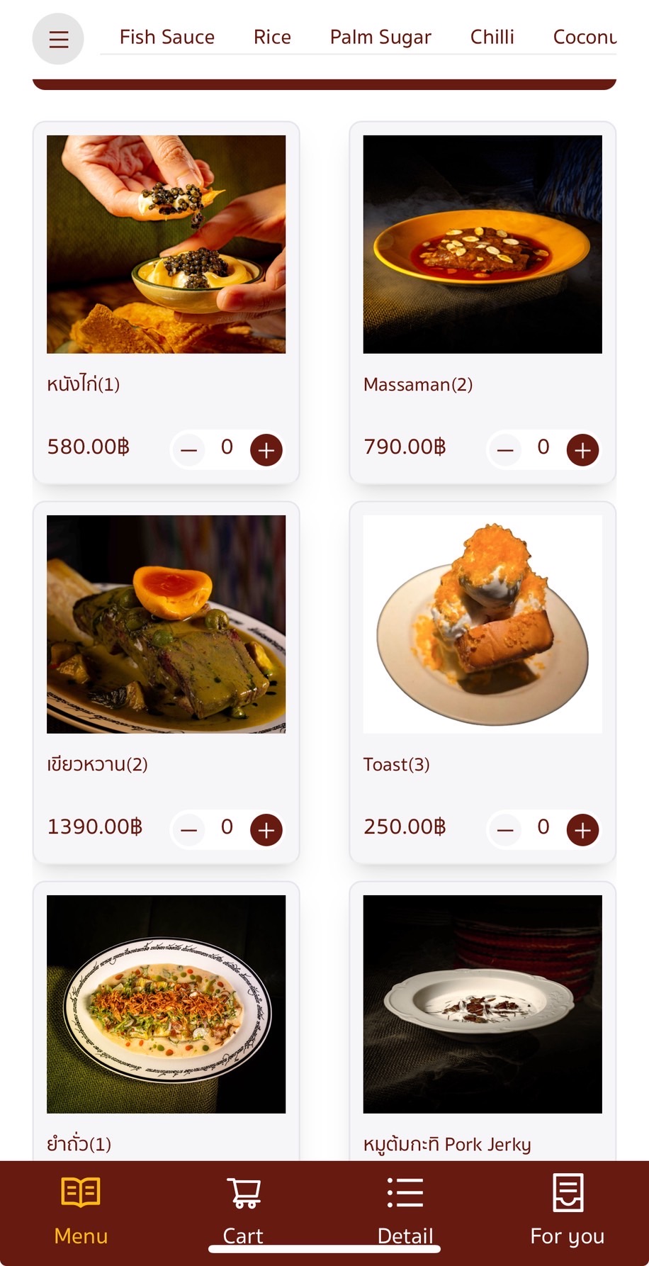 เมนูจะเน้นการใช้ "วัตถุดิบศักดิ์สิทธิ์ 5 อย่าง" ของไทยเป็นหลักในการปรุงรสและสร้างสรรค์ ได้แก่ ข้าว, พริก, มะพร้าว, น้ำปลา, และน้ำตาลโตนด