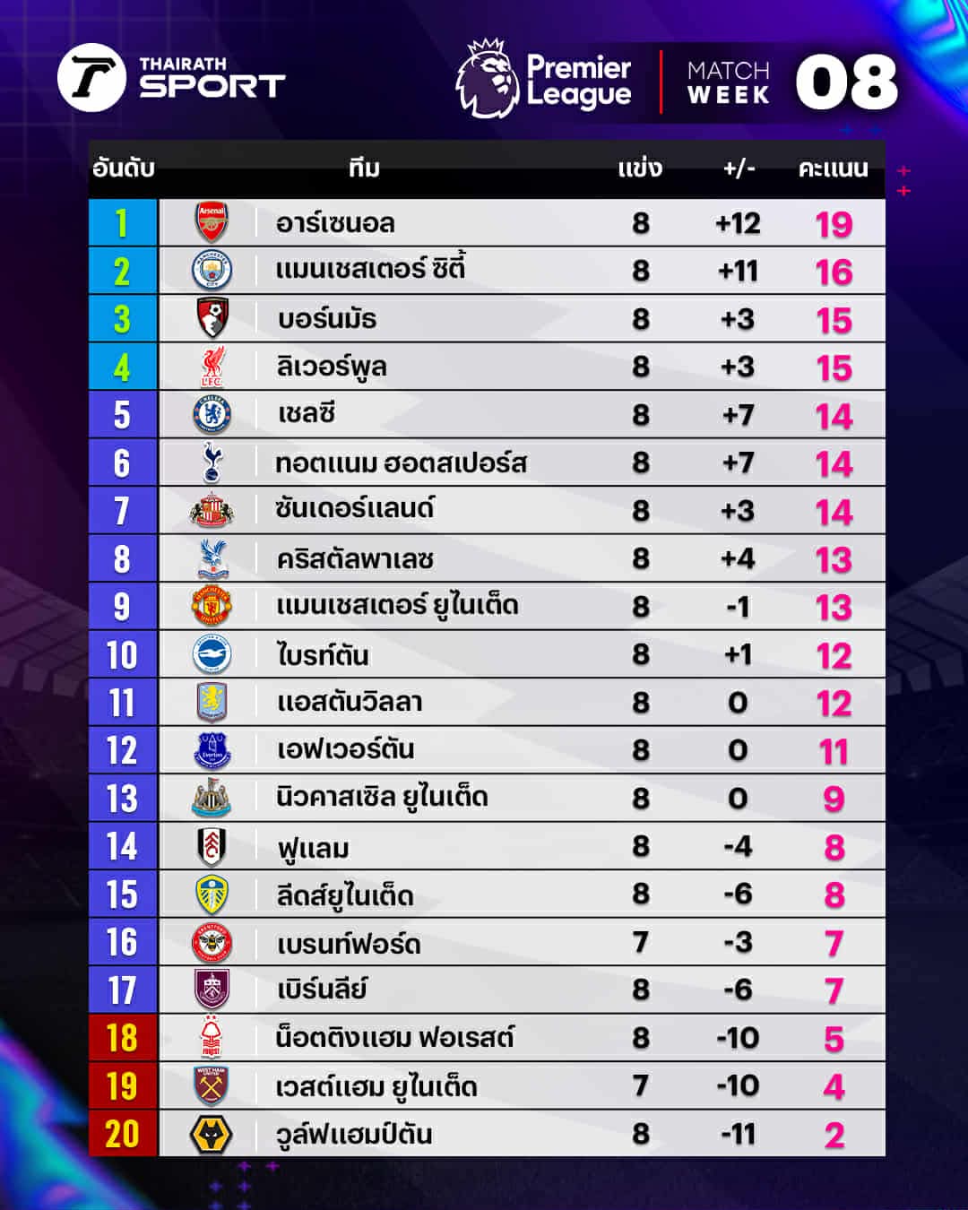 ขณะที่ แมนเชสเตอร์ ยูไนเต็ด จากการคว้าชัยศึกแดงเดือด ทำให้พวกเขาเก็บเพิ่มเป็น 13 คะแนน ขึ้นมาอยู่อันดับ 9 ของตารางเรียบร้อยแล้ว
