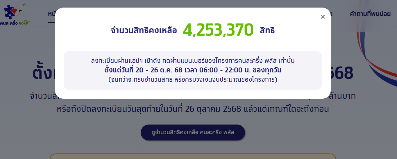 คนละครึ่งพรุ่งนี้ 6 โมงเช้า สิทธิจะเต็มกี่โมงคะ (จำกัด 20 ล้านสิทธิ)