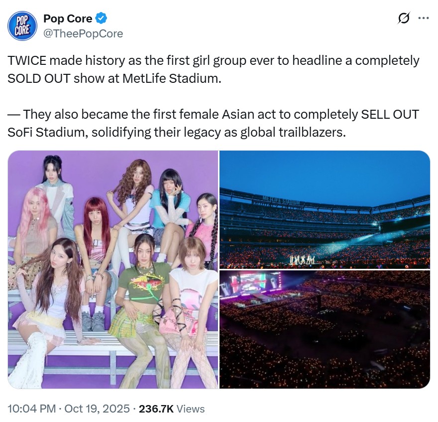 TWICE สร้างประวัติศาสตร์ในฐานะ เกิร์ลกรุ๊ปวงแรก ที่เป็นศิลปินหลักในการแสดงที่ MetLife Stadium โดยบัตรเข้าชม ขายหมดเกลี้ยง ทุกที่นั่ง
